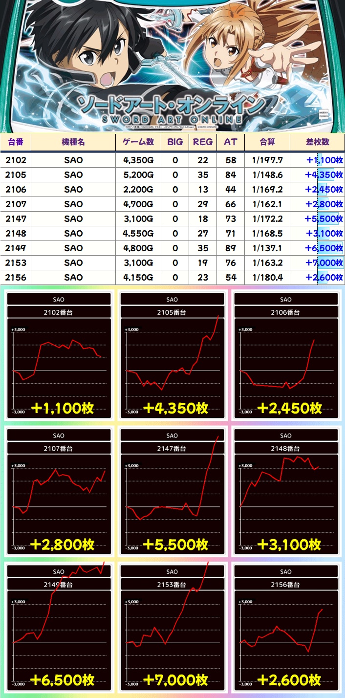 特日を問わず毎日優秀台が出現するAKIBA神3。⑥の日はAKIBA神3がさらに優秀で今回ではSAOが特に好成績でした。いずれも5000枚超が複数出現!