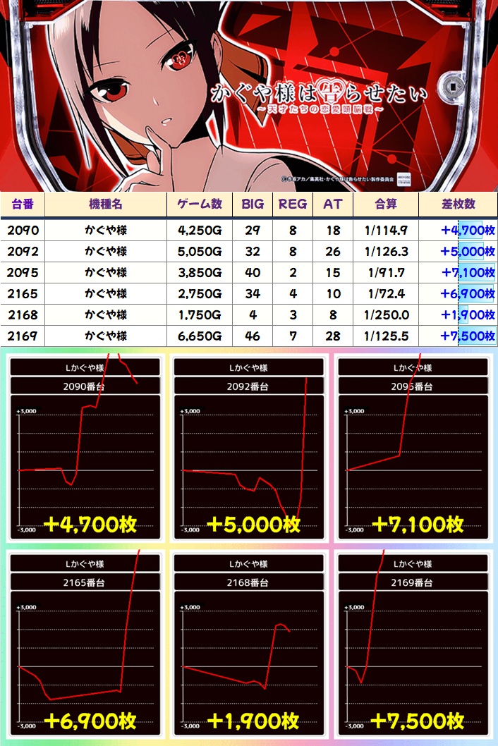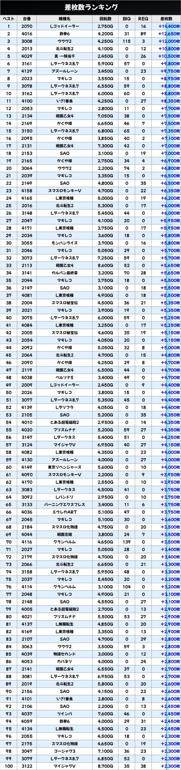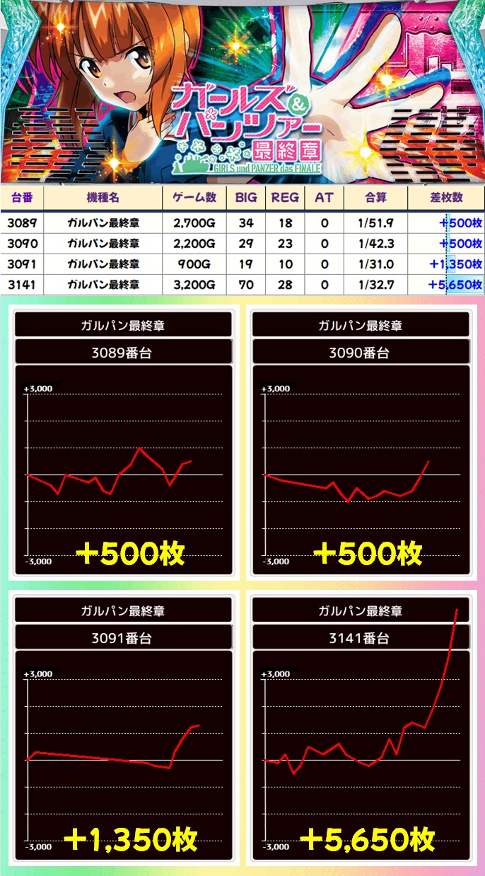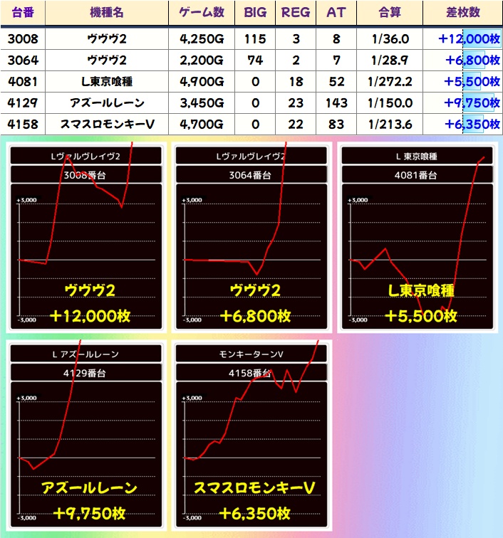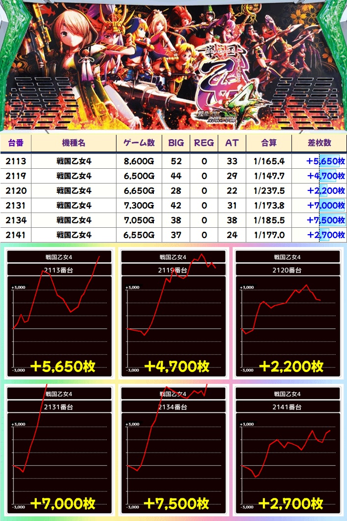 この日は万枚オーバーが5台と3000枚以上が約80台という結果に!