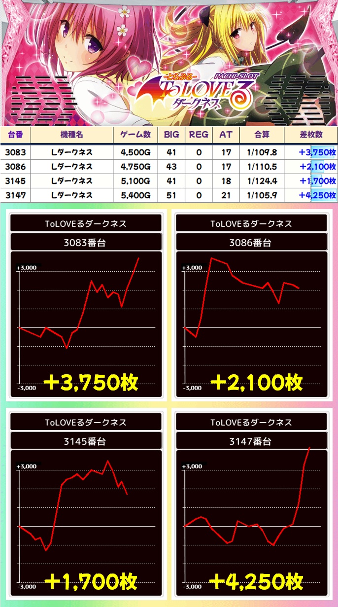 アキバは増台週は扱いが良く、この日もToLOVEるシリーズに優秀台多数!今後も増台や入れ替え台があればその台のシリーズや関連機種は要チェック!