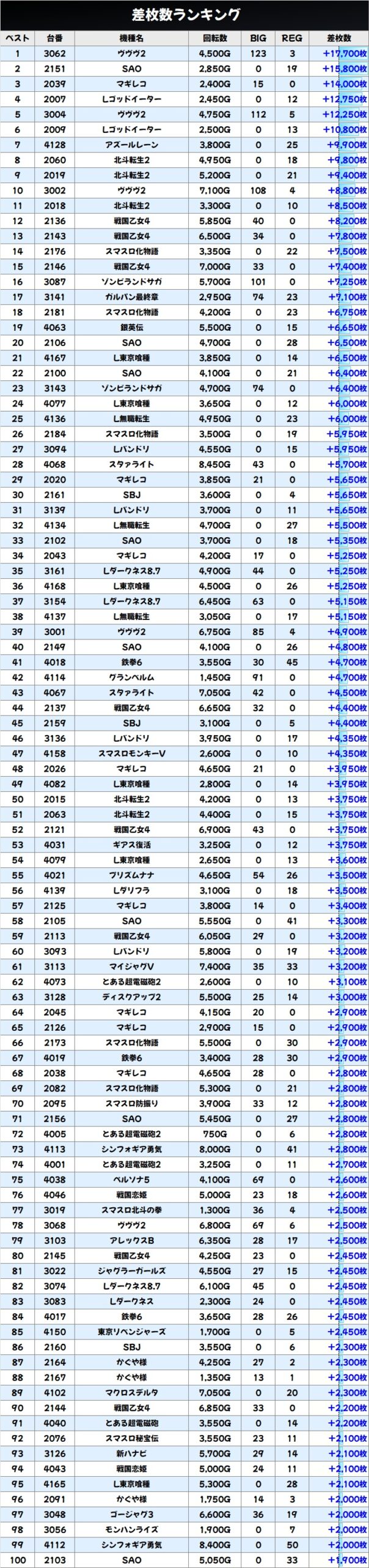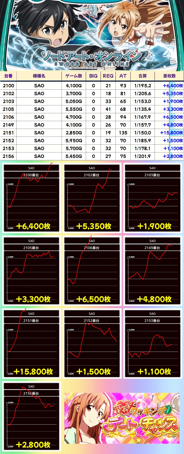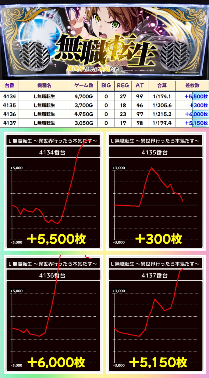 どちらも平均約+2000枚と素晴らしい結果を残しており、SAOからは万枚超!SBJや無職転生からは5000枚超台が複数ありました!