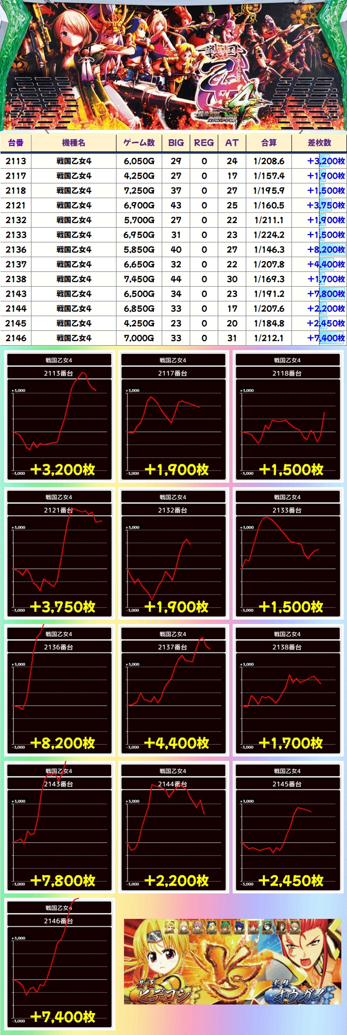 戦国乙女4(13/34台+)→平均+643枚