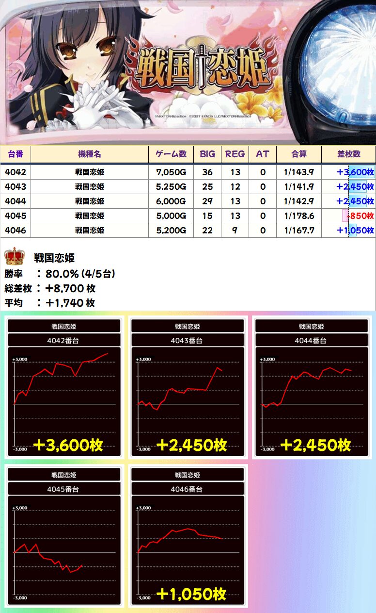 戦国恋姫 (4/5台+) ➡平均 +1,740枚