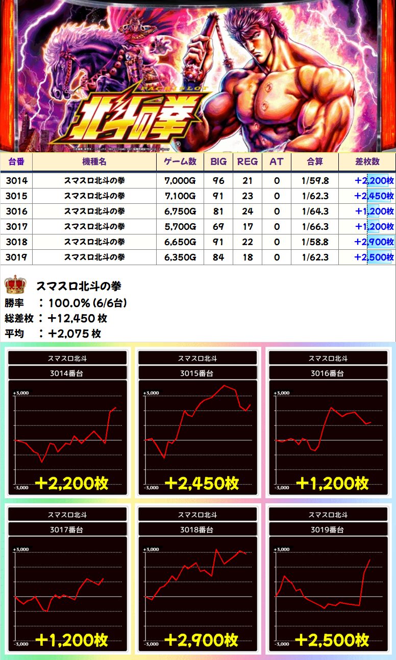 スマスロ北斗の拳 (6/6台+) ➡平均 +2,075枚