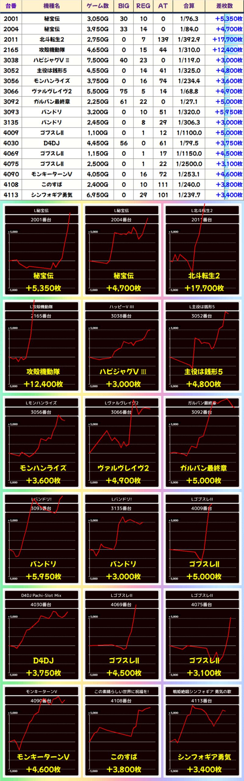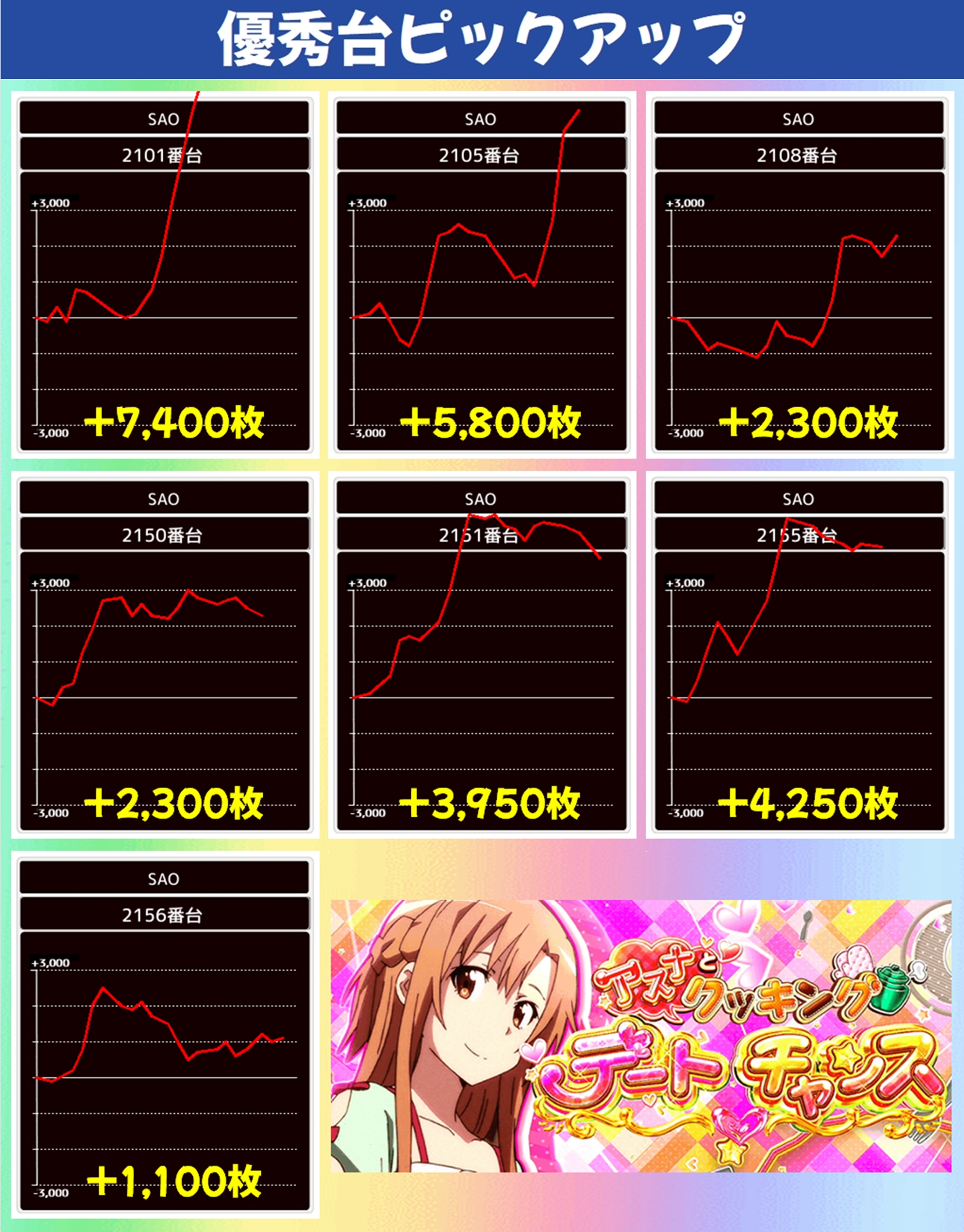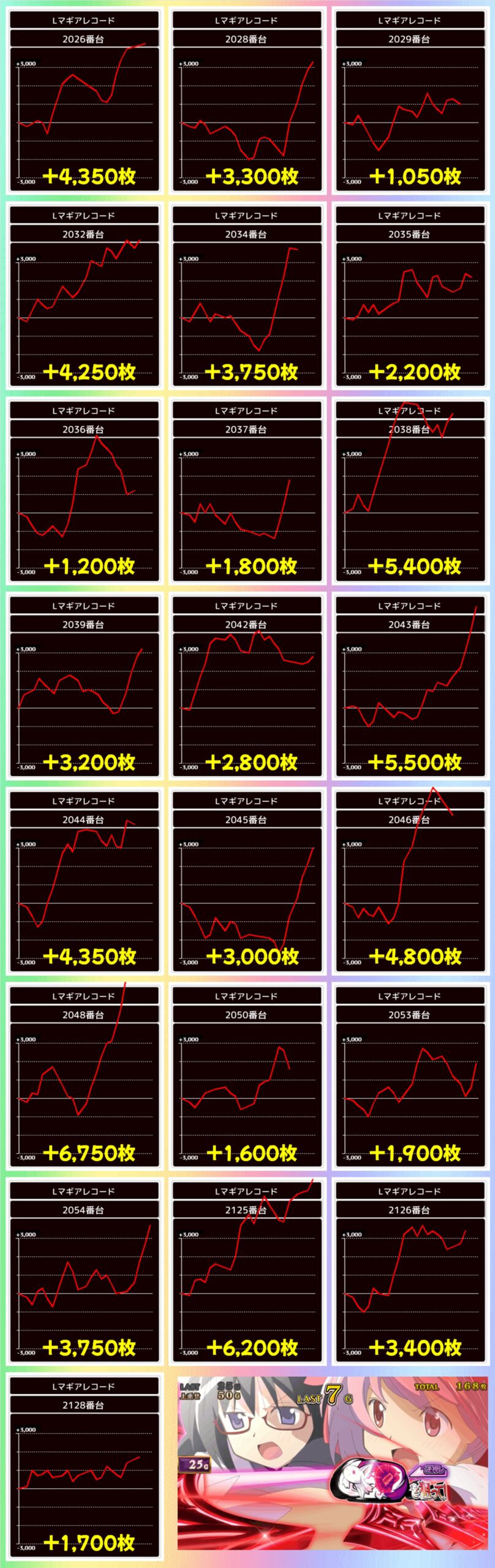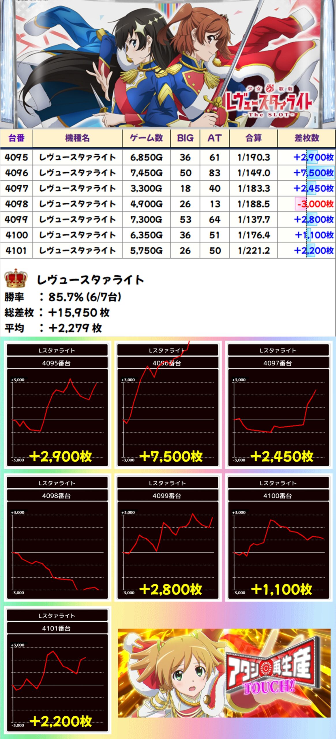 レヴュースタァライトは1台が不発となってしまいましたが、その他5台がプラスとなり、+7500枚という大量出玉も出現。