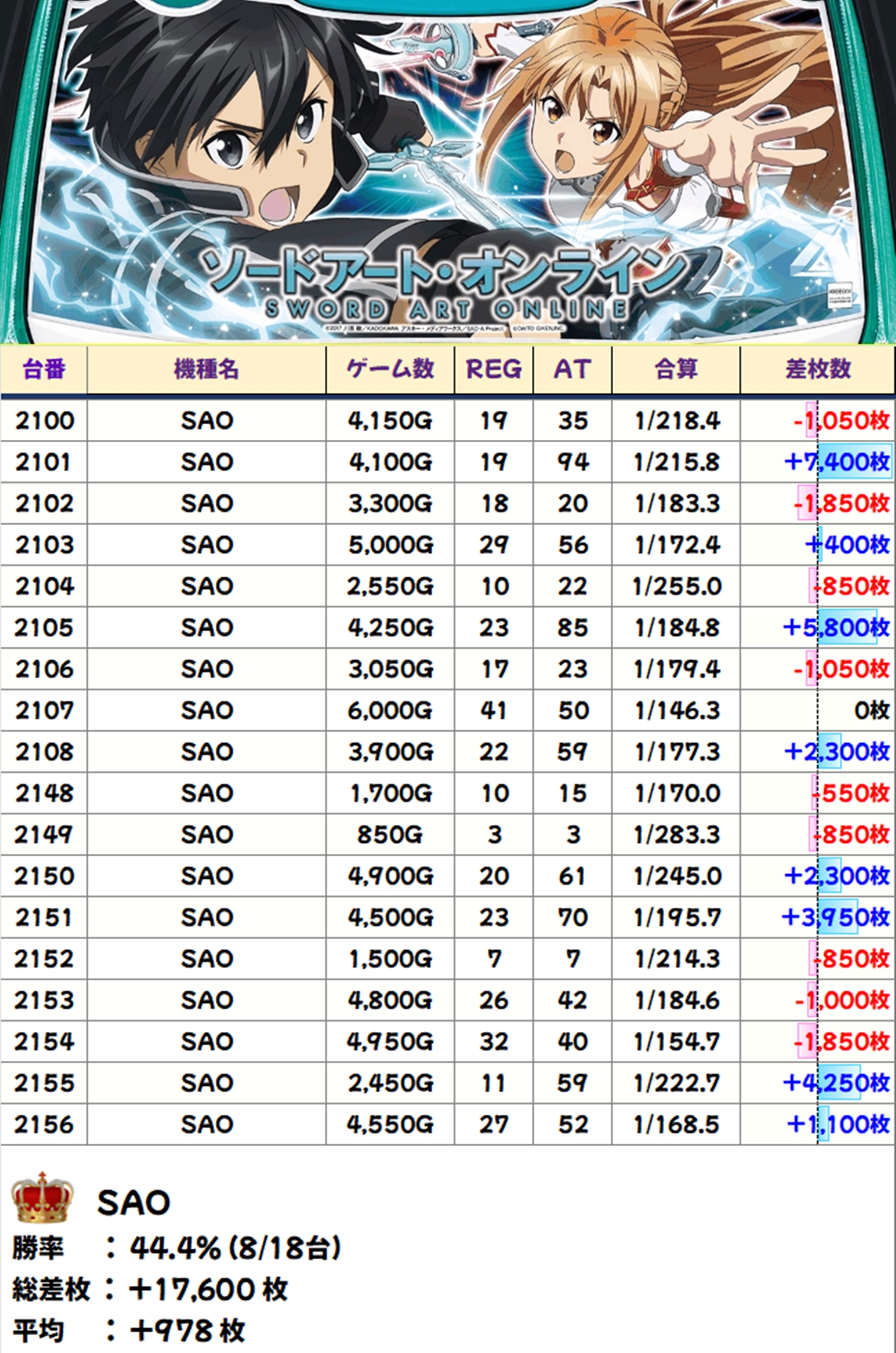 この日の神3も間違いなしで、3機種全てが平均約+1000枚の好成績に。また、戦国乙女4からは+11700枚の万枚オーバーも確認でき、マギアレコード、SAOも含めて大量出玉が続出する結果となりました。