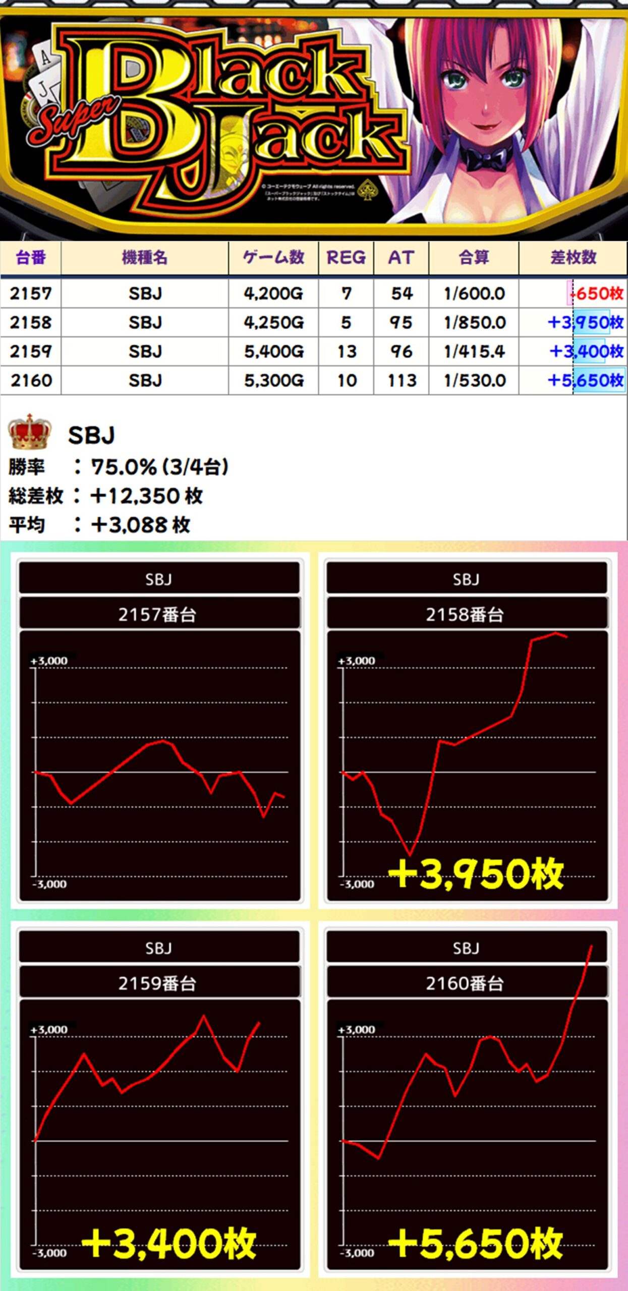 SBJは+5650枚、+3950枚、+3400枚とプラスの3台はいずれも優秀な出玉に。不発の台もありましたが、平均で+3000枚を超える結果となりました!