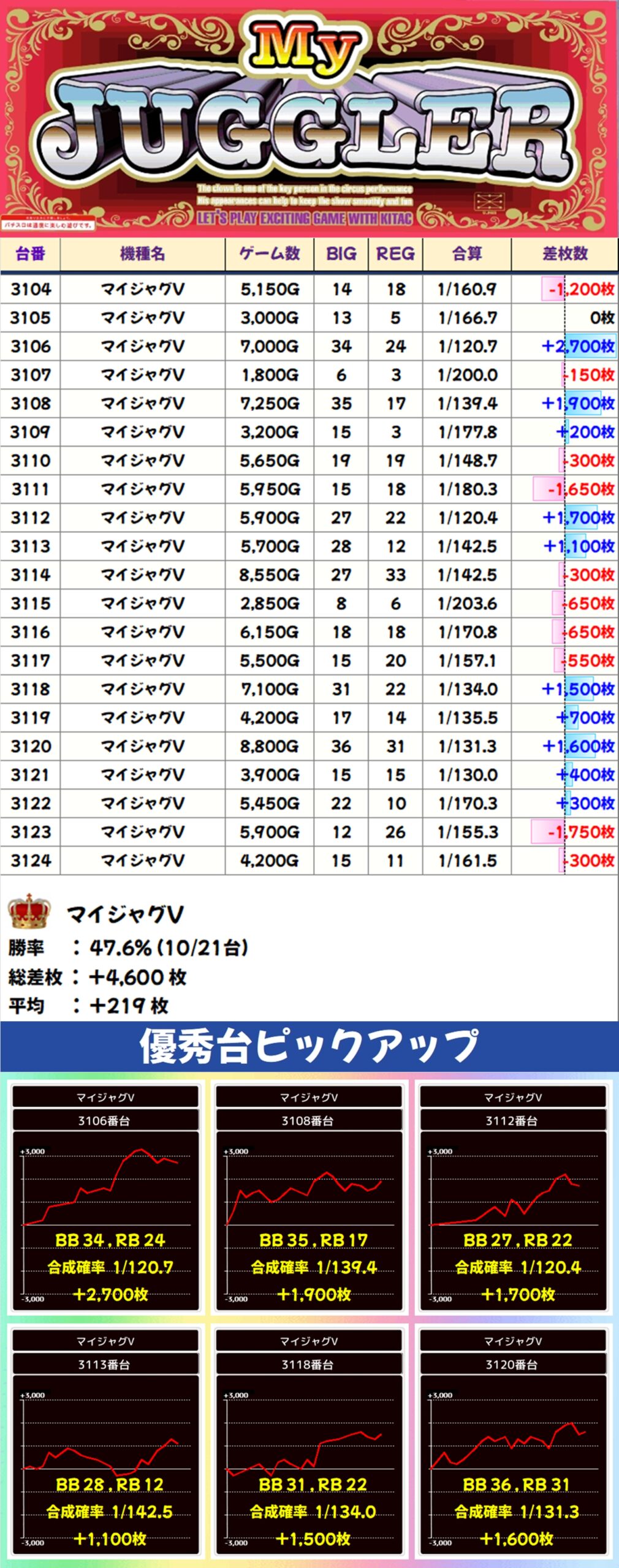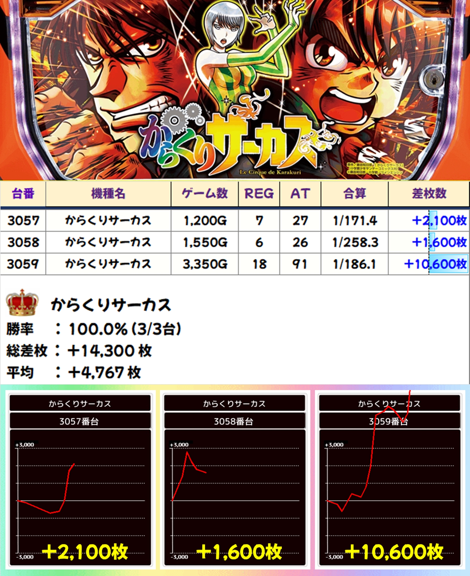 からくりサーカスからは+10600枚の万枚オーバーが飛び出し、他の2台もしっかりプラス差枚に。平均で+4700枚オーバーという見事な結果となりました!