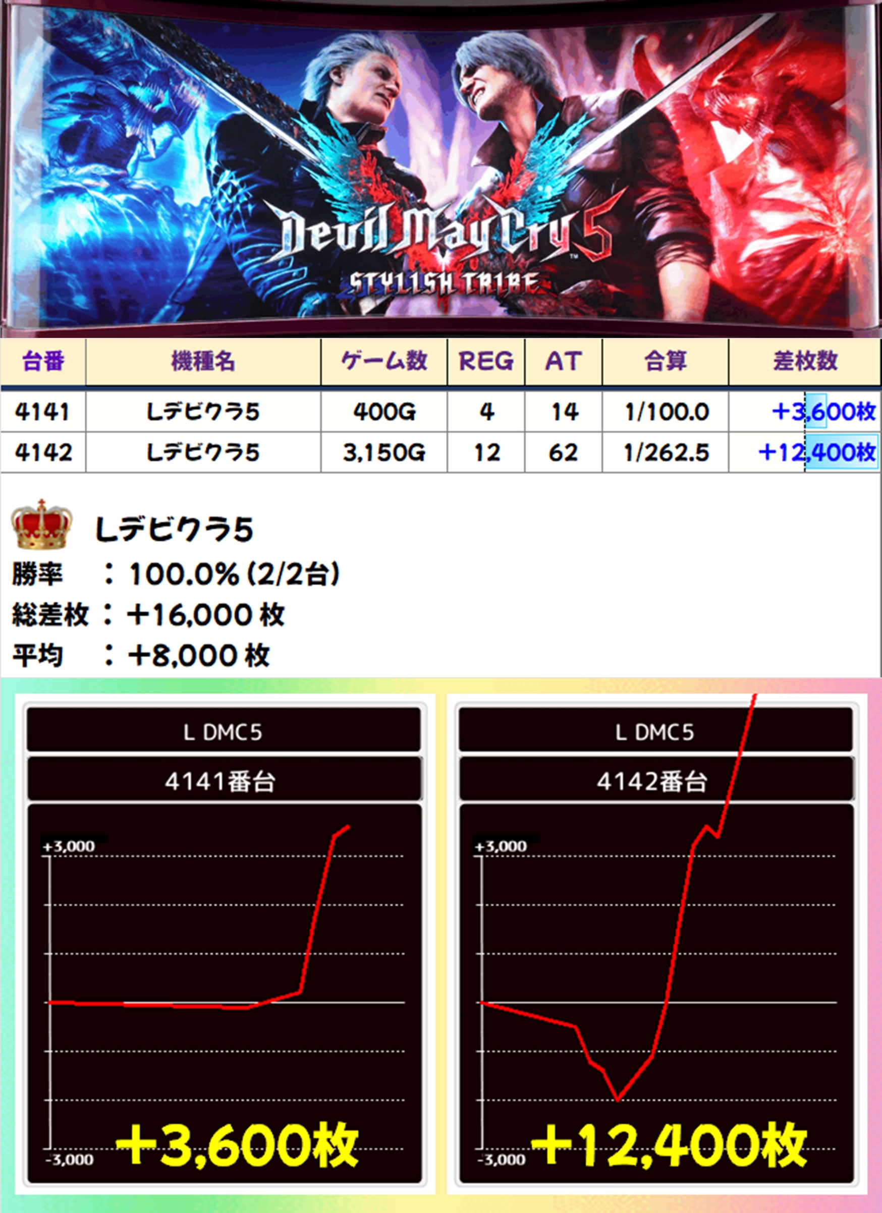 また、Lデビクラ5、マクロスデルタは全台がプラスとなり、特にLデビクラ5は圧巻の結果に。+12400枚と+3600枚で平均+8000枚という見事な結果でした。