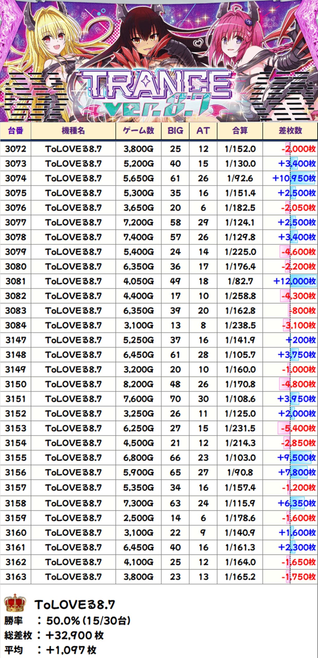 ToLOVEる8.7(15/30台+)→平均+1,097枚