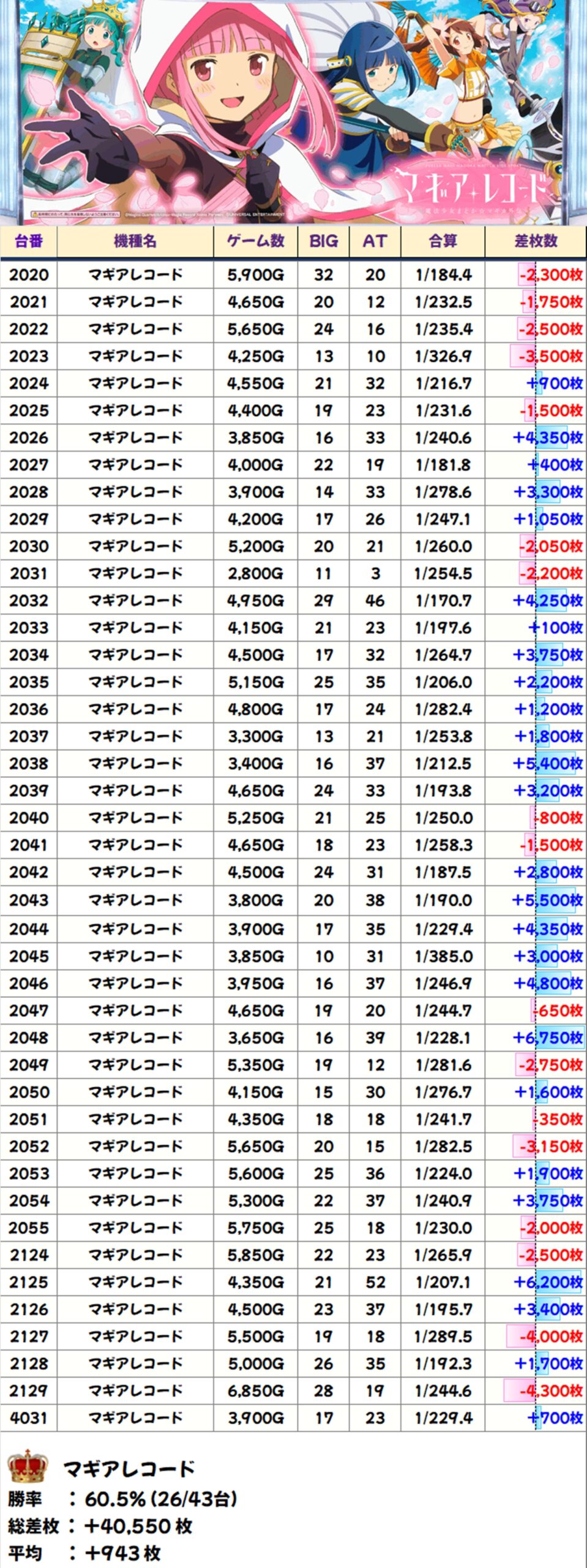 マギアレコード(26/43台+)→平均+943枚