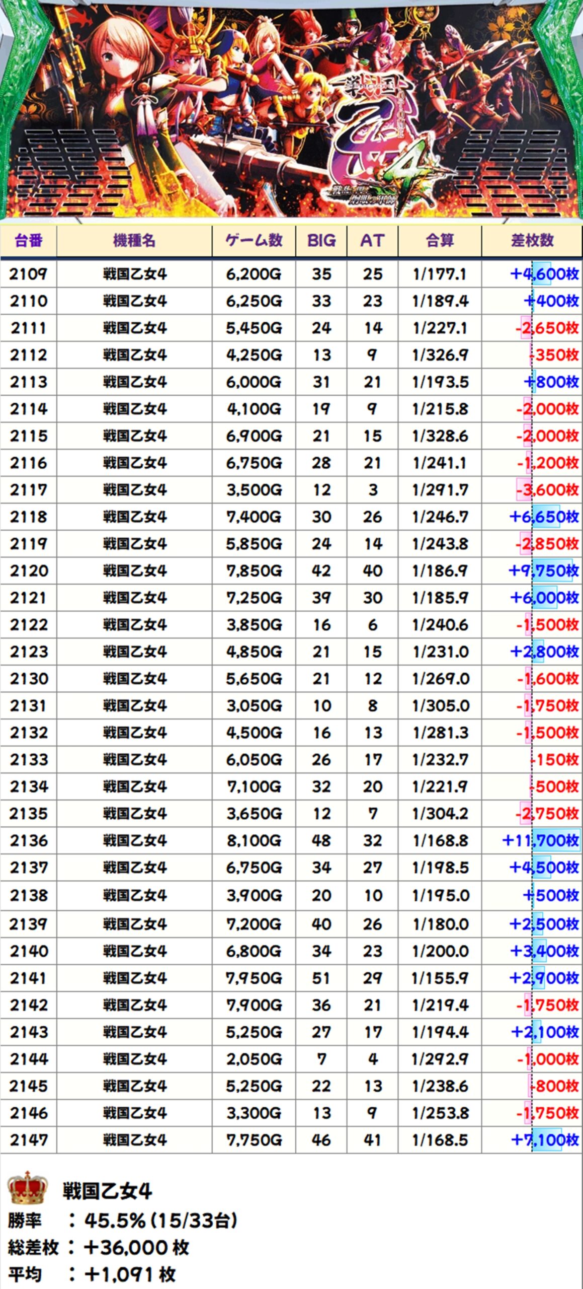 戦国乙女4(15/33台+)→平均+1,091枚