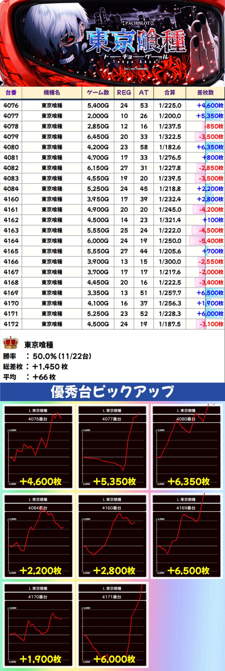 また、東京喰種からも優秀な出玉を確認でき、半数の台がプラス差枚となっておりました!