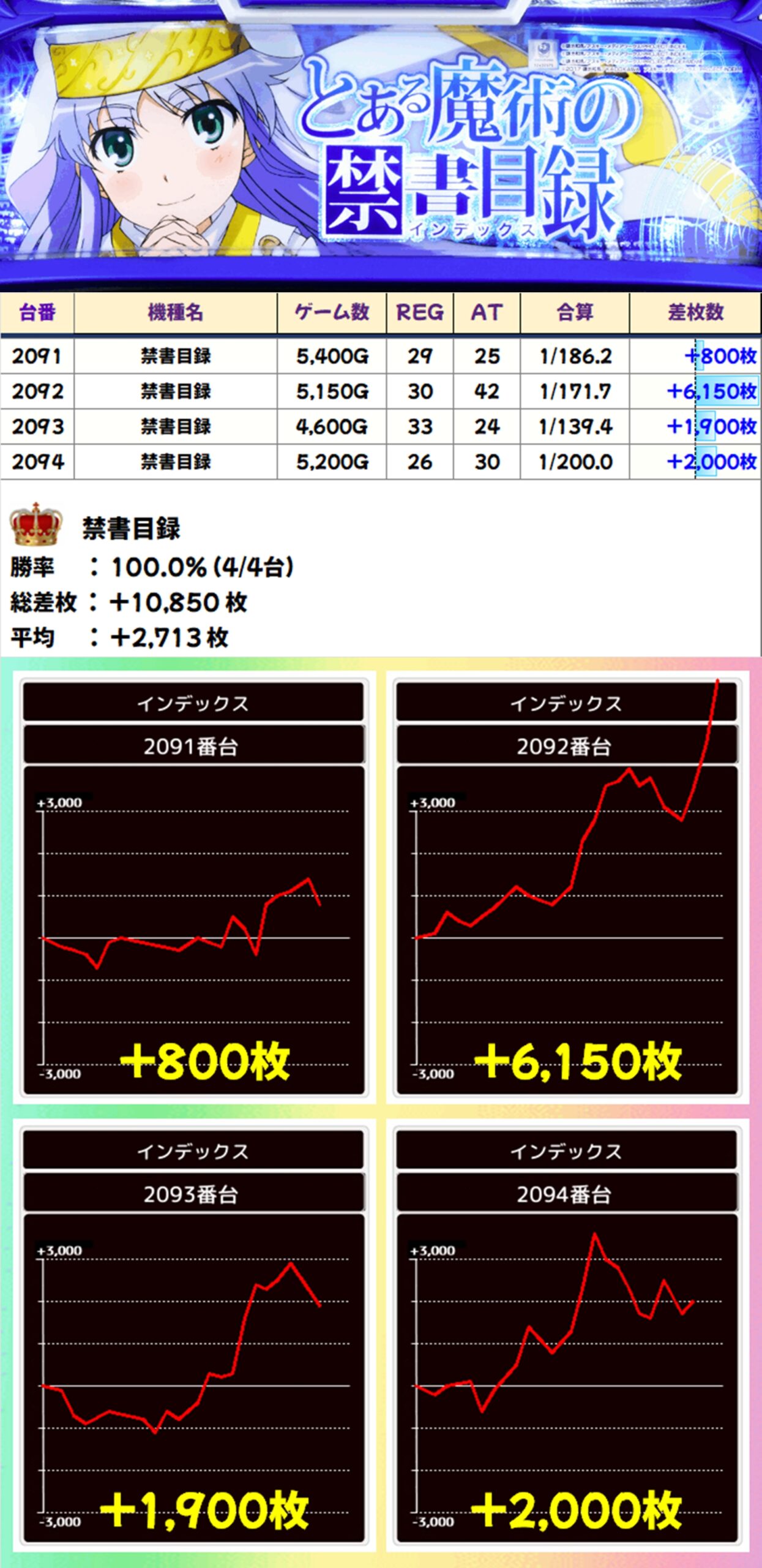 禁書目録は+6150枚の大量出玉を確認でき、4台全てがプラス差枚に!