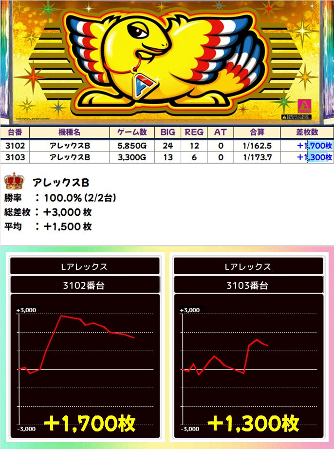 『少台数機種』アレックスB(2/2台+)➡平均+1,500枚