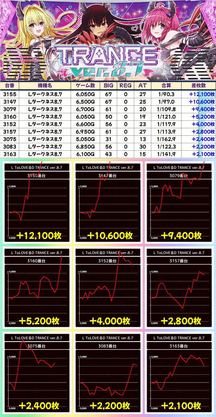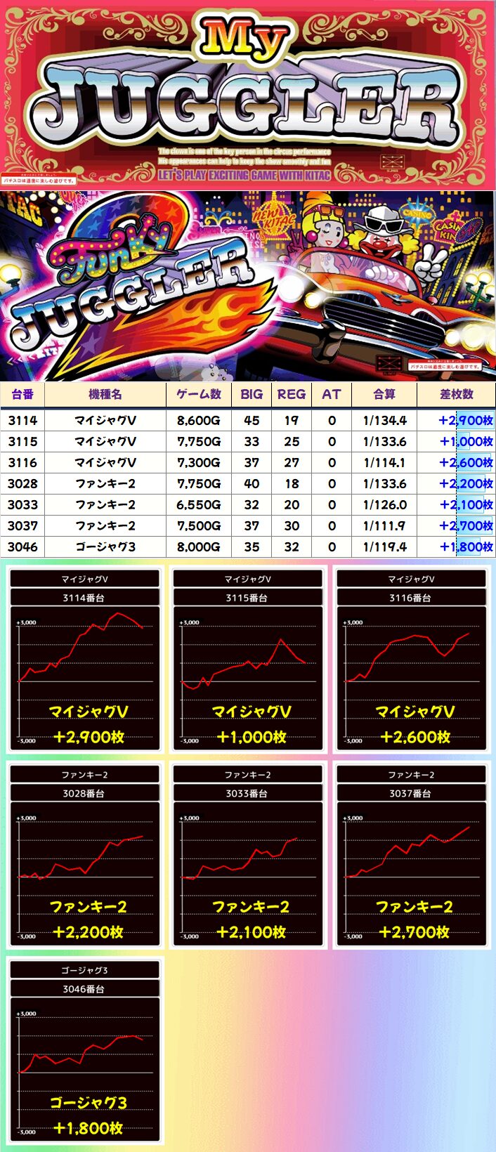 この日は上記で取り上げた機種以外にも、単品も優秀台多数!万枚9台、3000枚以上が計84台!!