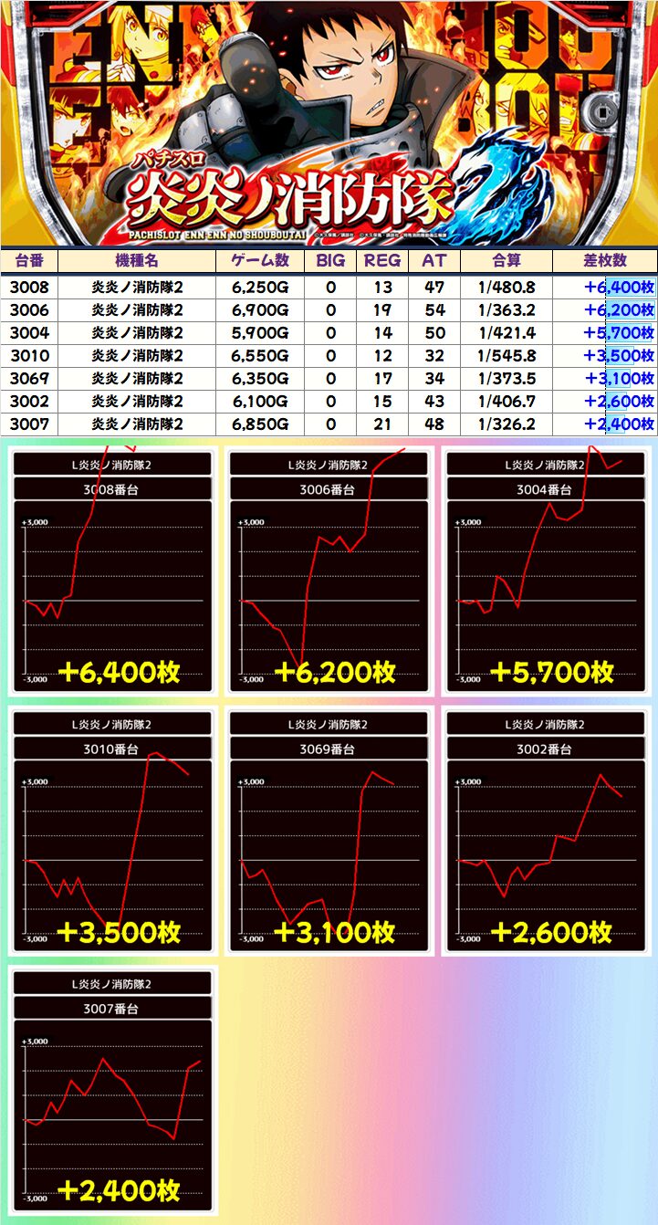 中でも「炎炎ノ消防隊2」は+6,000枚超×2件!+5,700枚!+3,000枚超×2件!+2,000枚超×2件!打ち手には感じるものがあったか!?