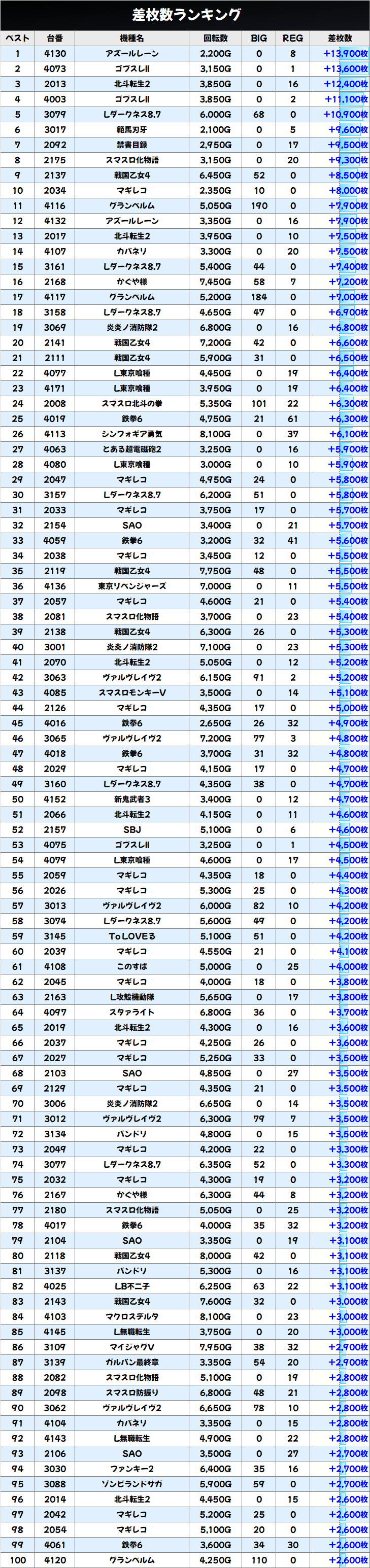 +2,900枚を筆頭に半分の台がプラス!