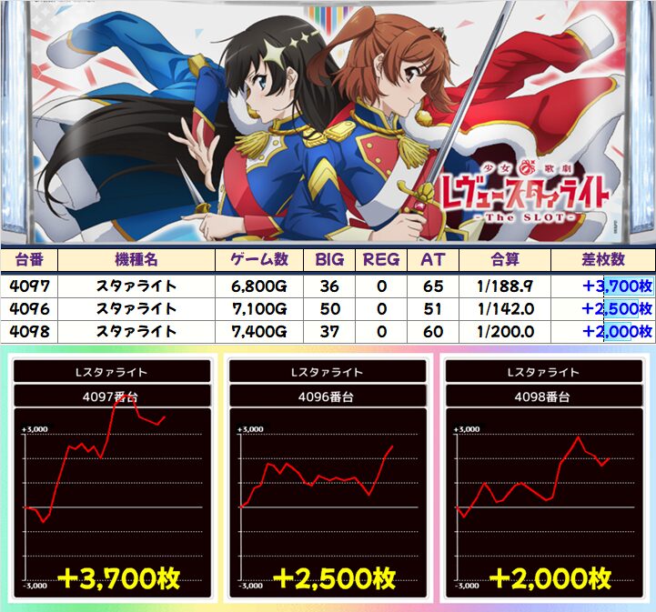 スタァライト(3/7台+)➡平均+657枚