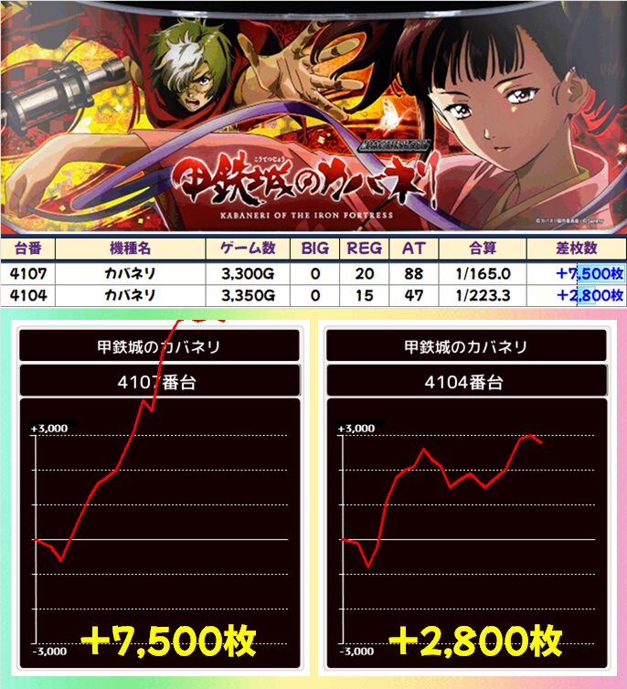 「カバネリのハリ」担当の美波わかなさんの声優誕。+7,500枚!+2,800枚!と半分の台が圧倒的なプラス!