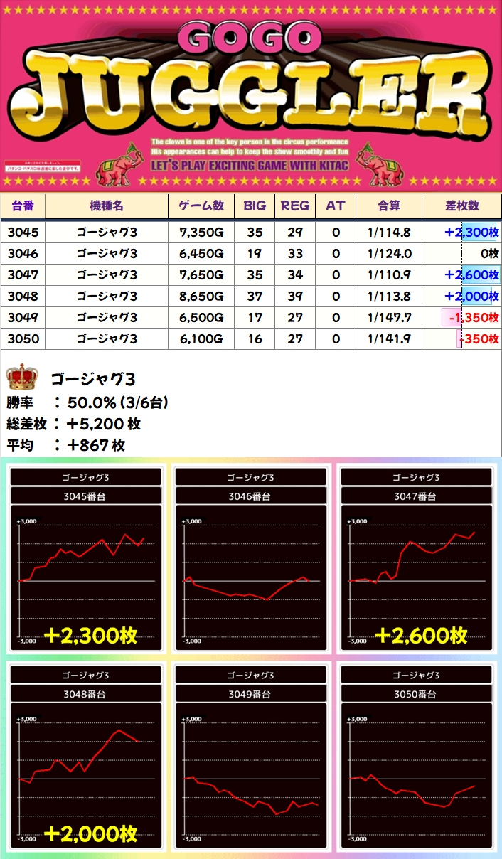 この日は全台系以外にも高配分機種が用意されていたようで、悪番対策でジャグラーシリーズからゴージャグが1/2系濃厚に!