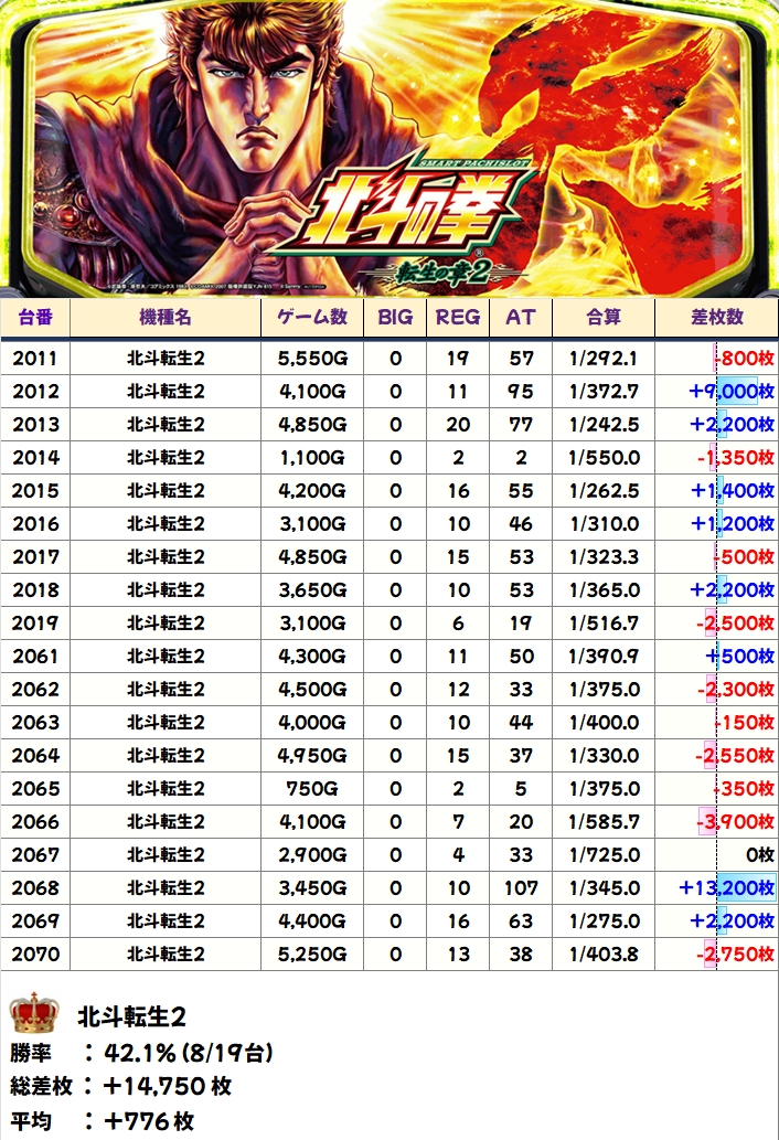【1/2系濃厚】北斗転生2(8/19台+)→平均+776枚