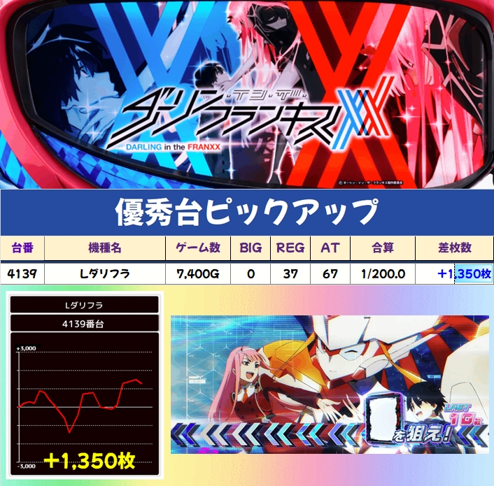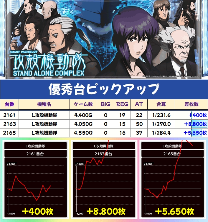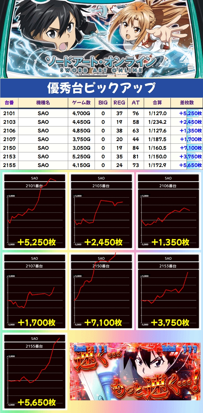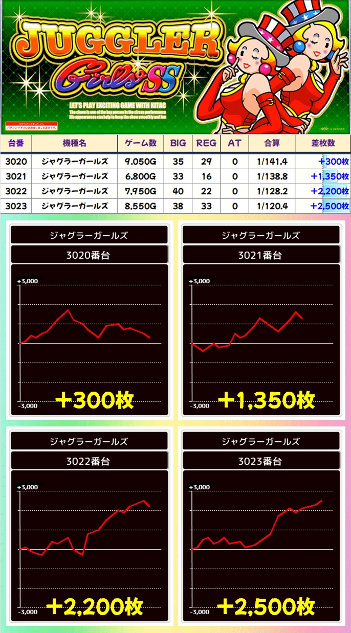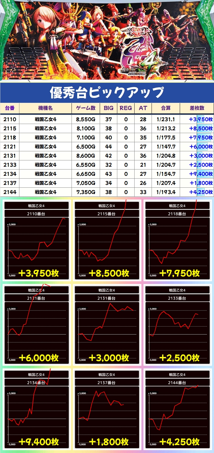 この日は幅広い機種にお宝台が投入されており、少台数機種からも優秀台を確認!