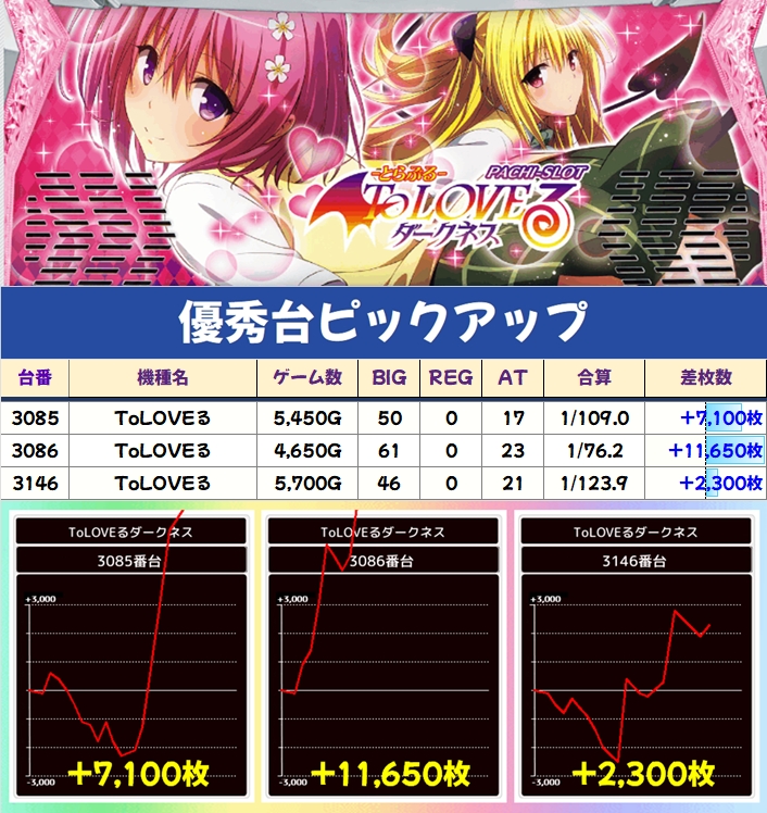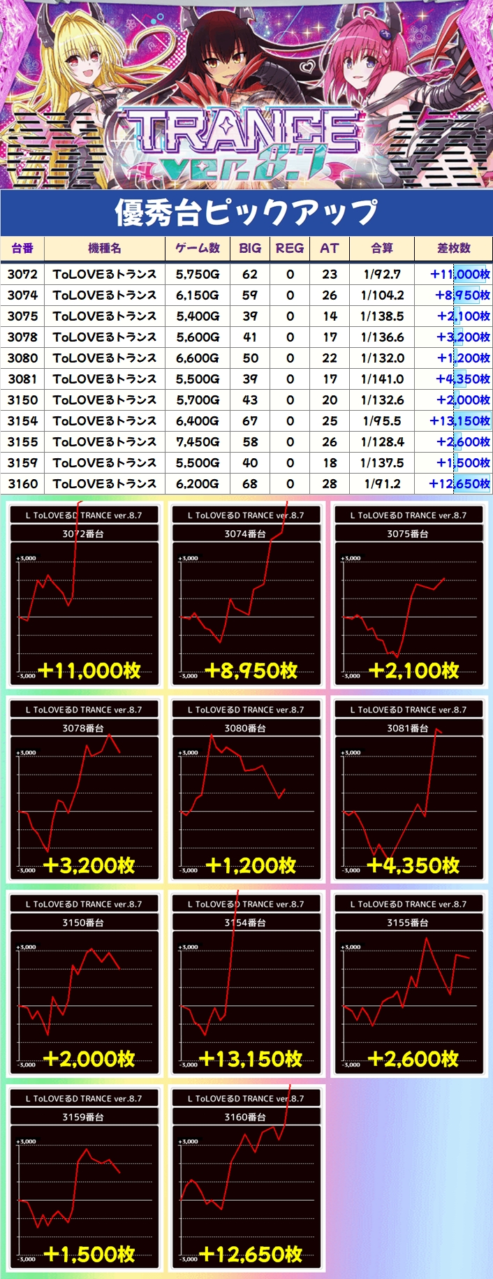 ToLOVEるトランスに関してもベースアップされており、万枚オーバーが3台と大量出玉が続出していましたよ!