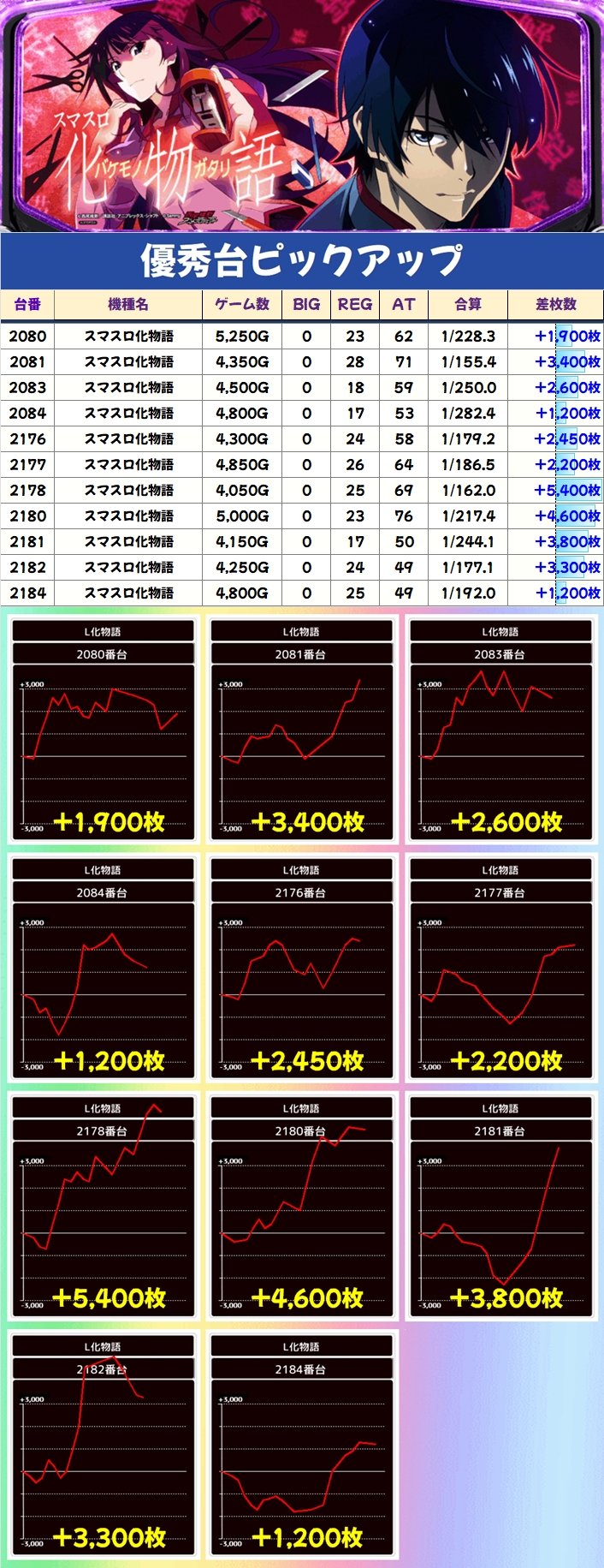 この日は人気機種にもしっかりお宝台が多数用意されていたようで、ToLOVEると化物語に関しては1/2系と思しき結果に!