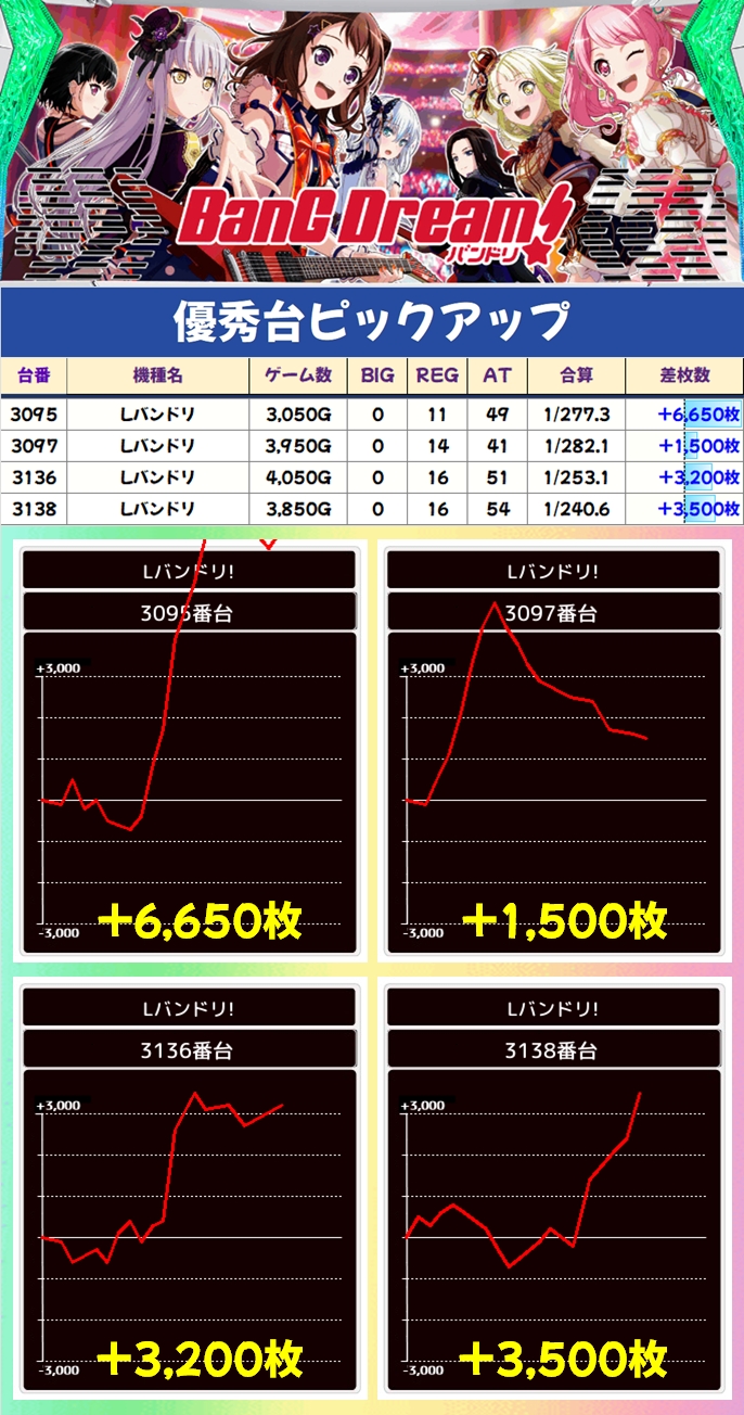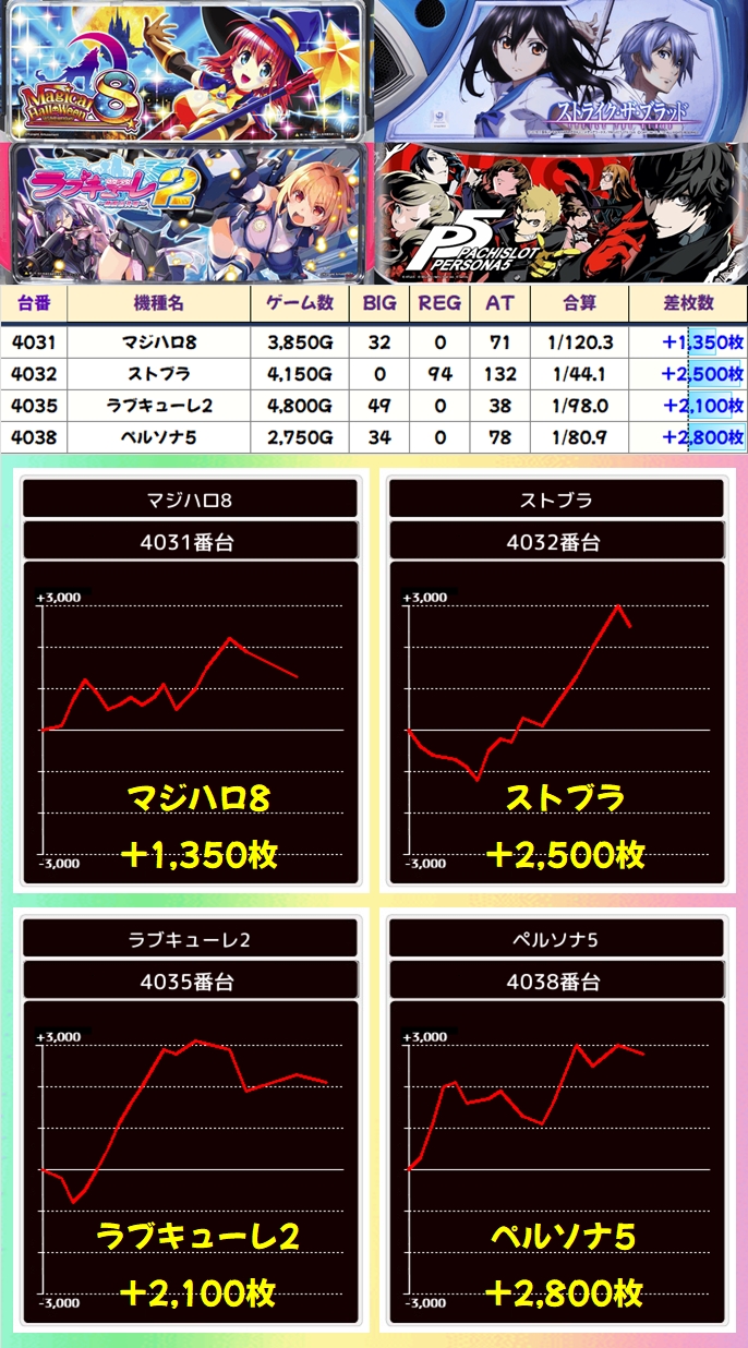 ゲリライベントと言えば全台系の仕掛けですが、今回も複数の機種が全台系濃厚となっており、プリズムナナは平均+4600枚と大幅プラスを記録!