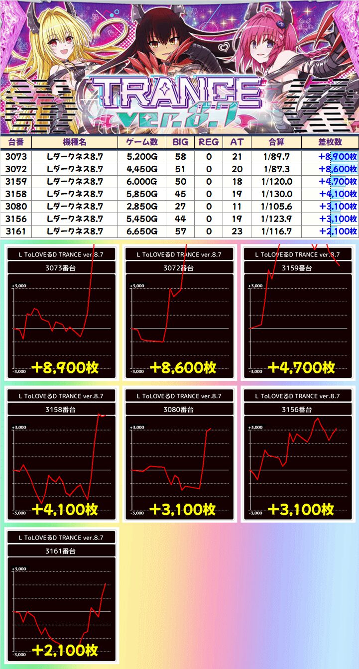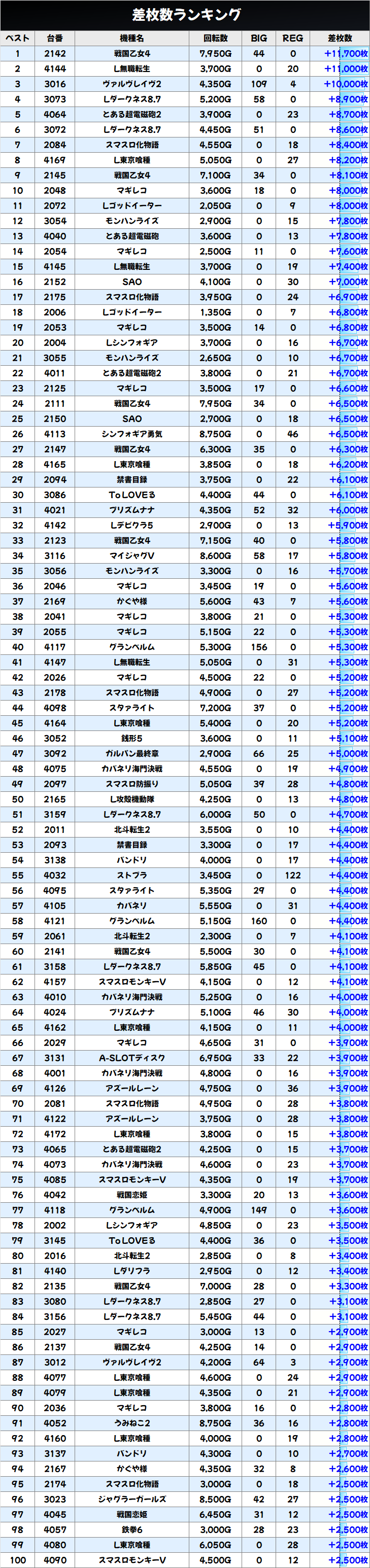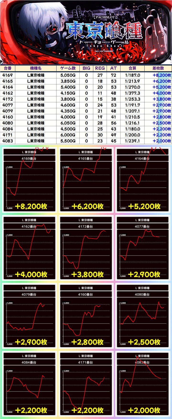 中でも「L東京喰種」は+8,200枚を筆頭に計12台が+2,000枚オーバーと特に目立っていました!