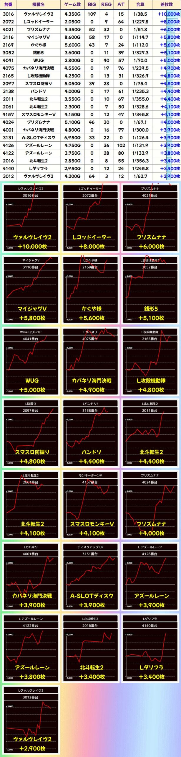 総差枚+19万枚オーバーということで、大量の仕掛け以外にもお宝台が続出!