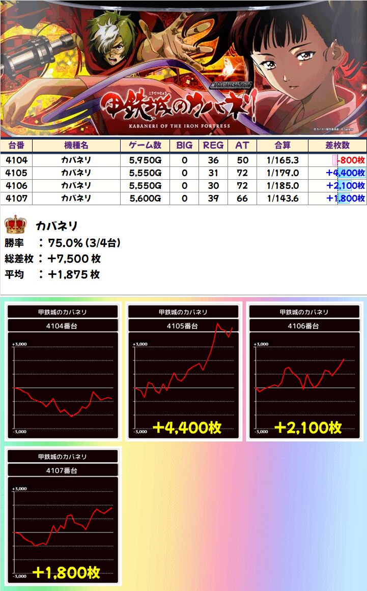 「カバネリ」は+4,400枚を筆頭に4台中3台が+1,500枚を突破!並びで「このすば」にも仕掛けがあった!?