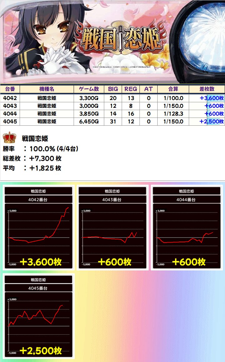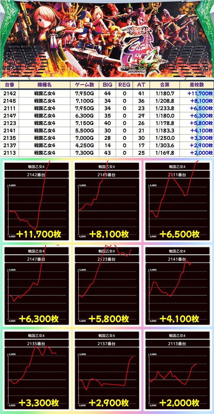 ジャンプの”アイコンキャラ関連機種”の「戦国恋姫」が仕掛け対象に!+3,600枚を筆頭に全台プラス差枚!!