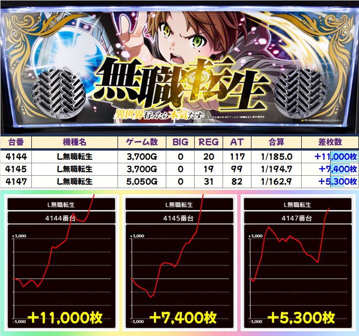 「無職転生」の万枚オーバーなど各機種から+5,000枚を超える優秀台を確認!