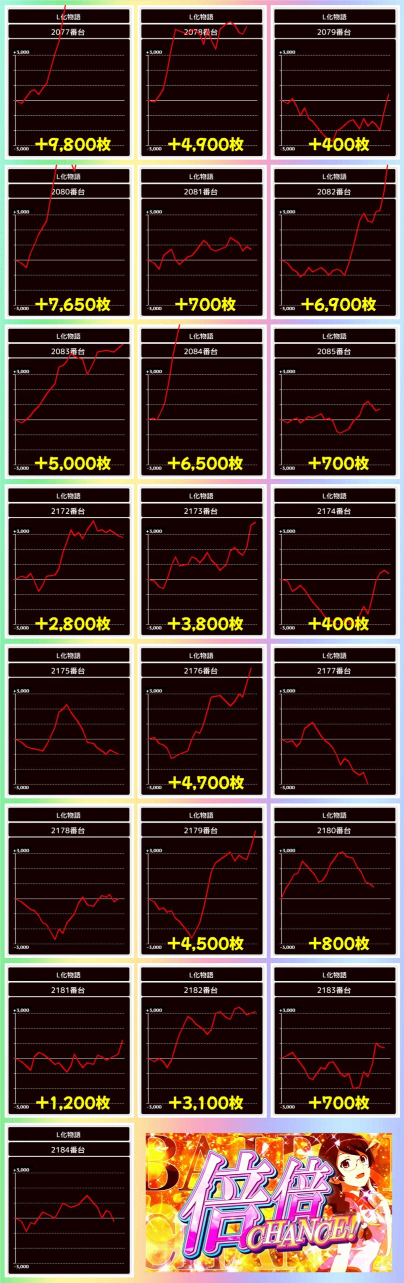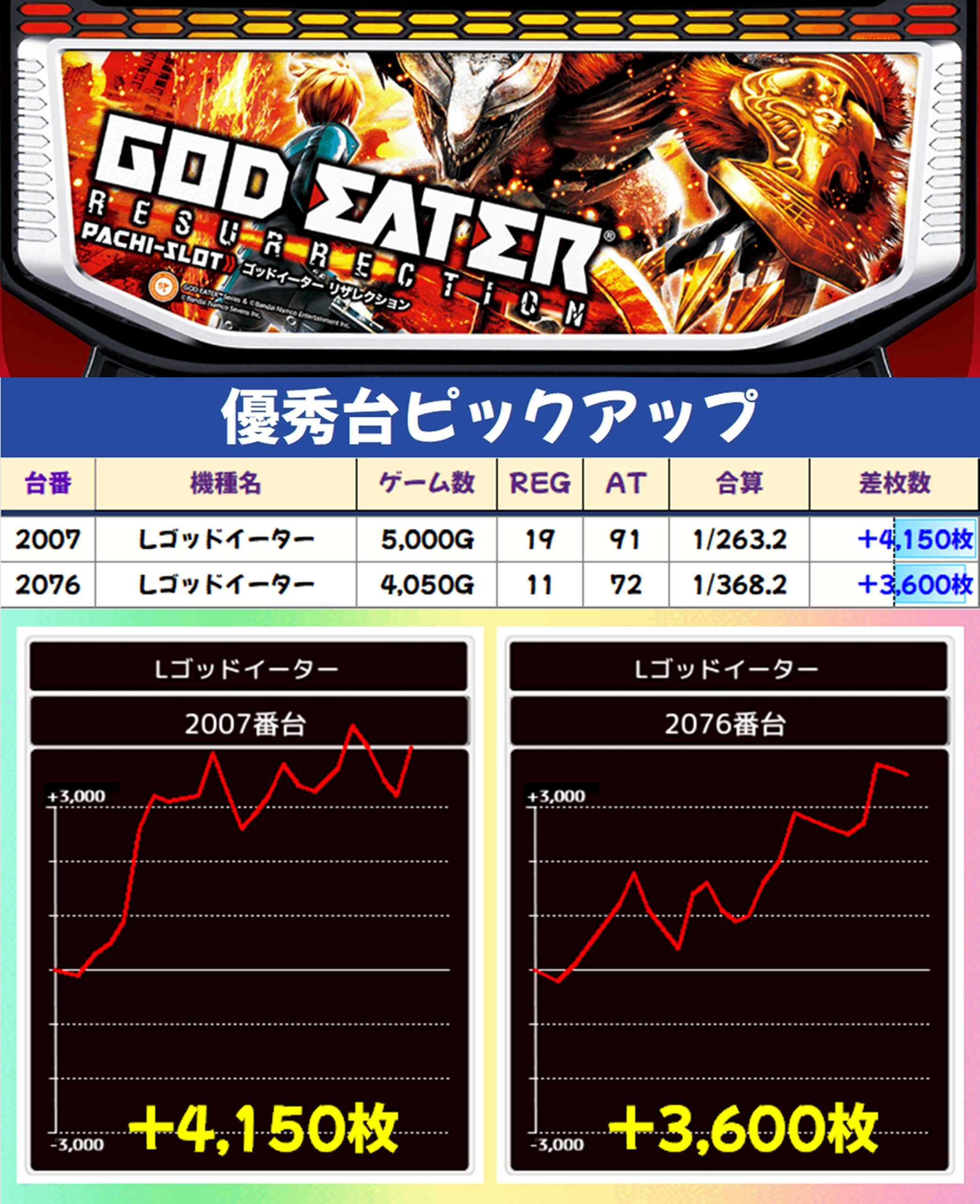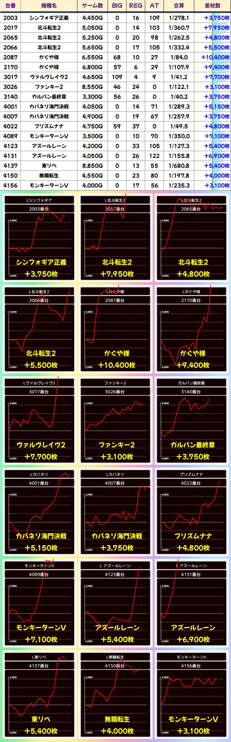 なお、マギアレコードは万枚オーバーの大爆発も飛び出し、半数近くがプラス差枚の結果となりました。こちらは高配分濃厚の仕掛けがあった可能性が高いですね!