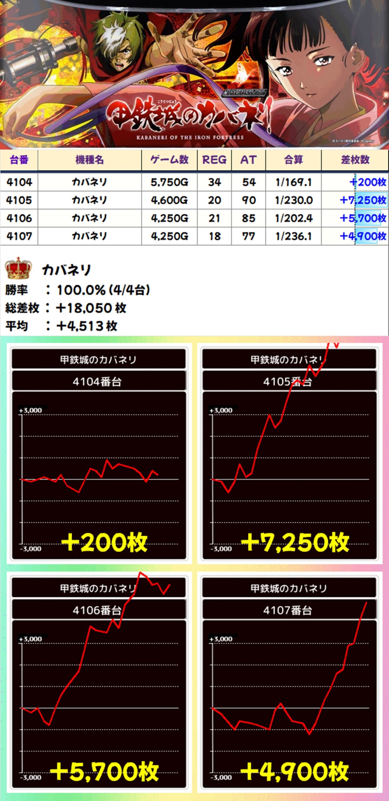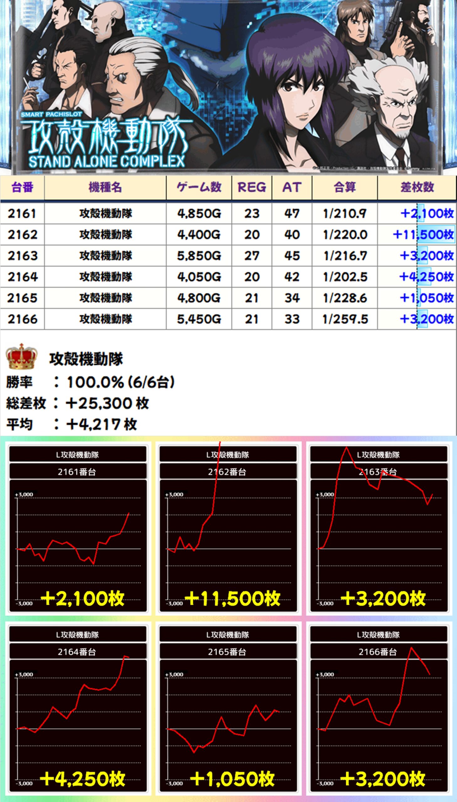 いずれの機種からも大量出玉が続出し、攻殻機動隊からは万枚オーバーも登場!なお、攻殻機動隊とカバネリは全台がプラスとなり、平均+4200枚オーバーと見事な結果になりましたね!