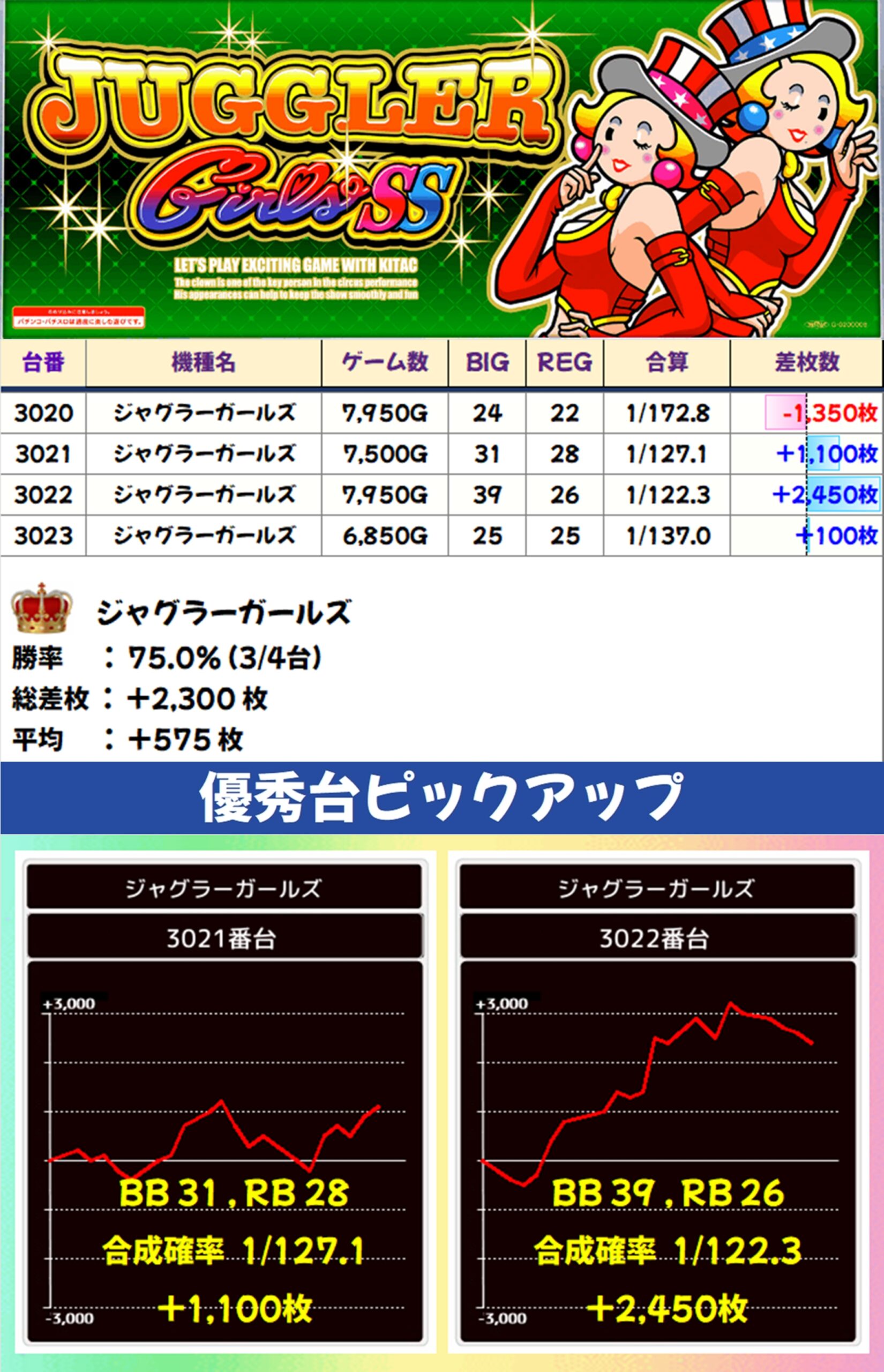 ジャグラーガールズ(3/4台+)→平均+575枚