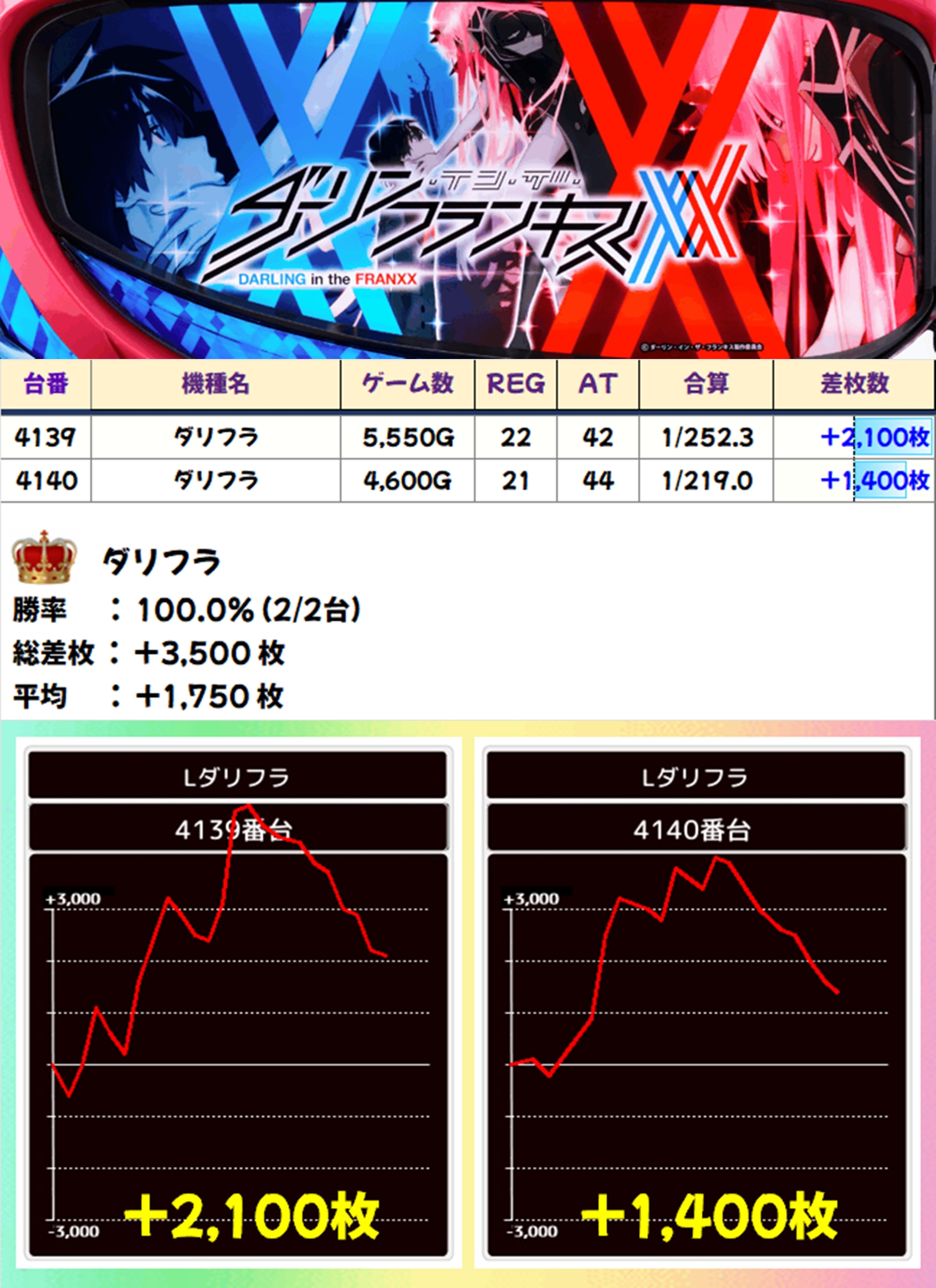 ダリフラ(2/2台+)→平均+1,750枚