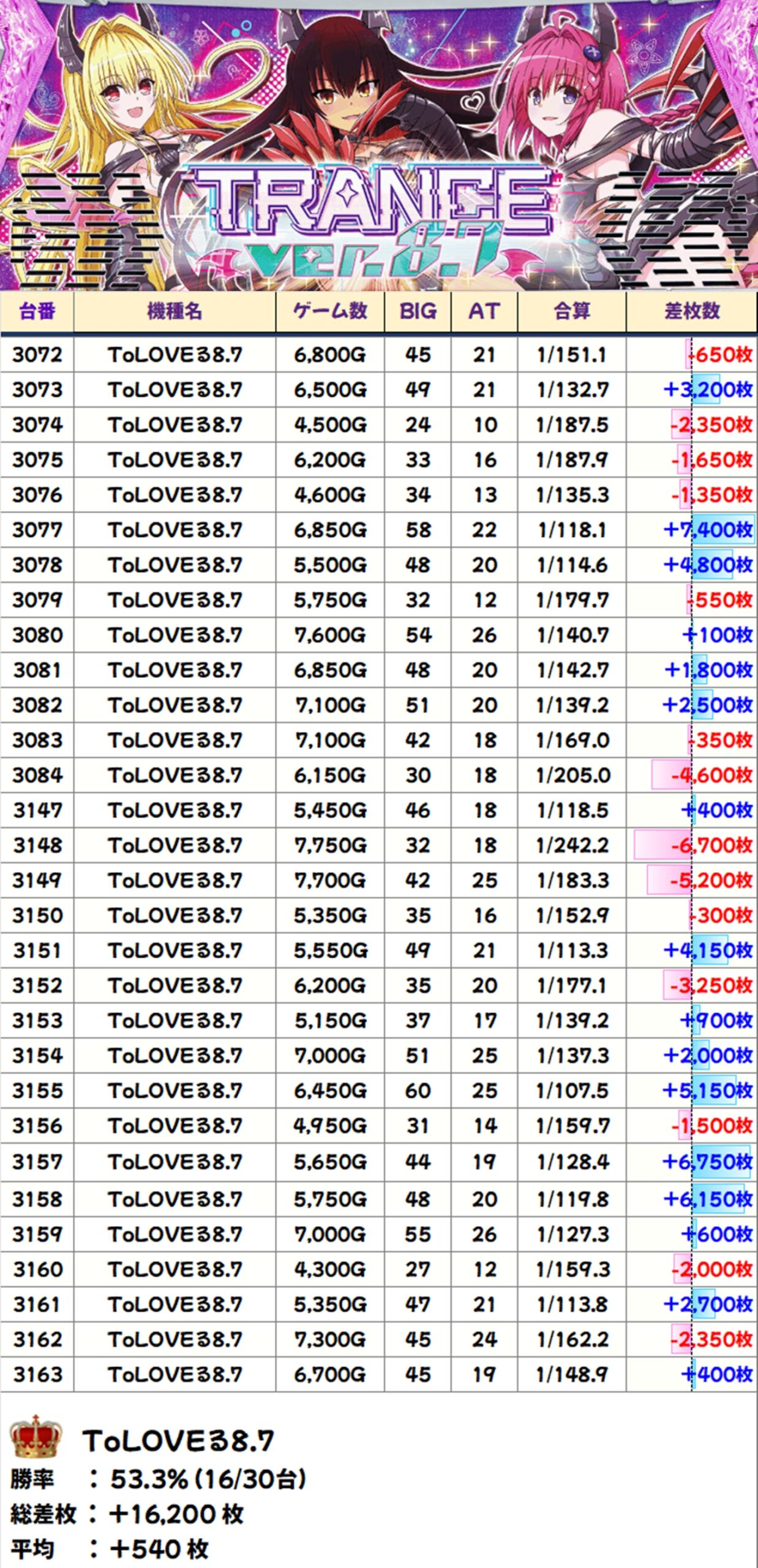 ToLOVEる8.7(16/30台+)→平均+540枚