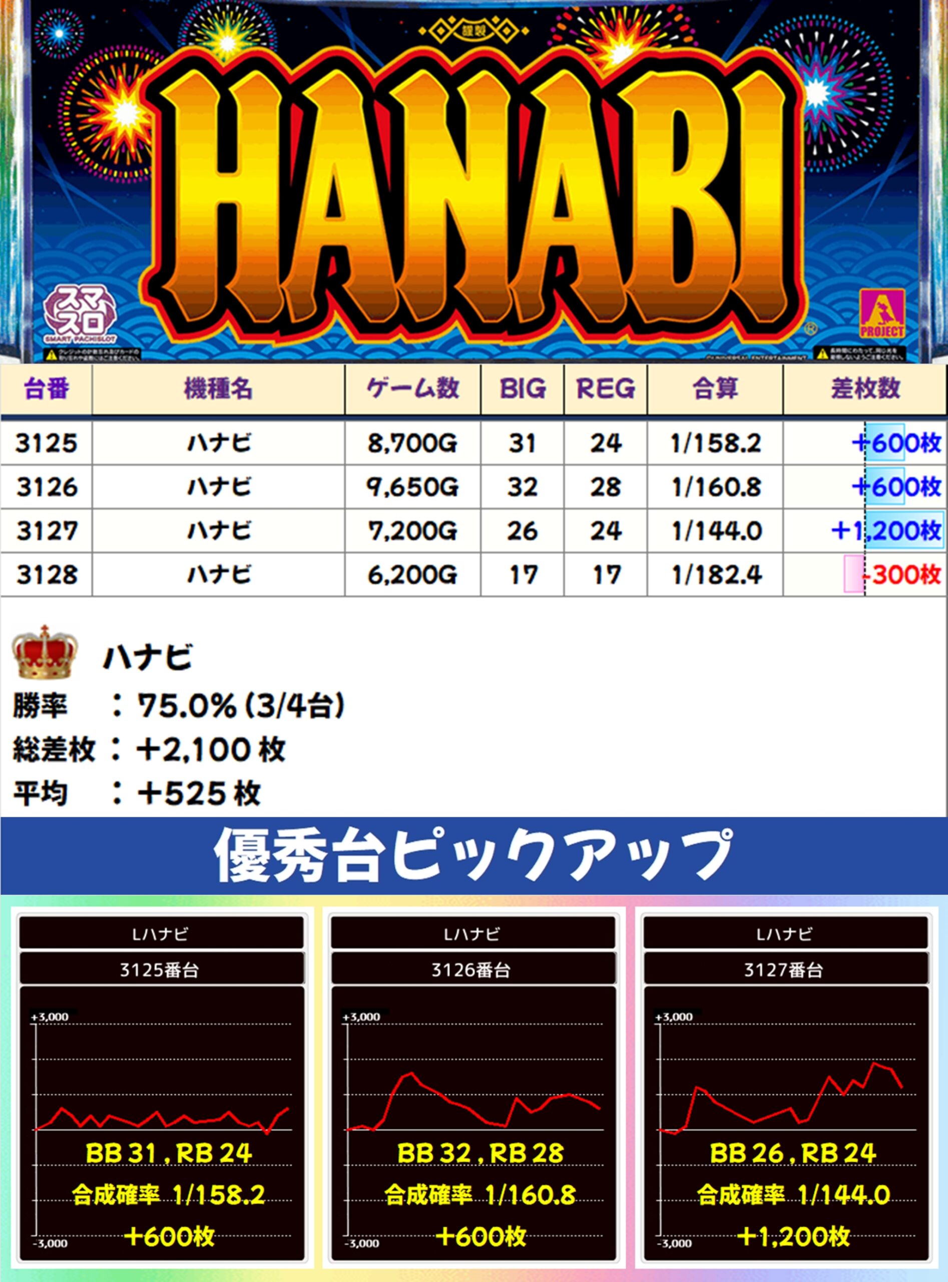 ハナビ(3/4台+)→平均+525枚
