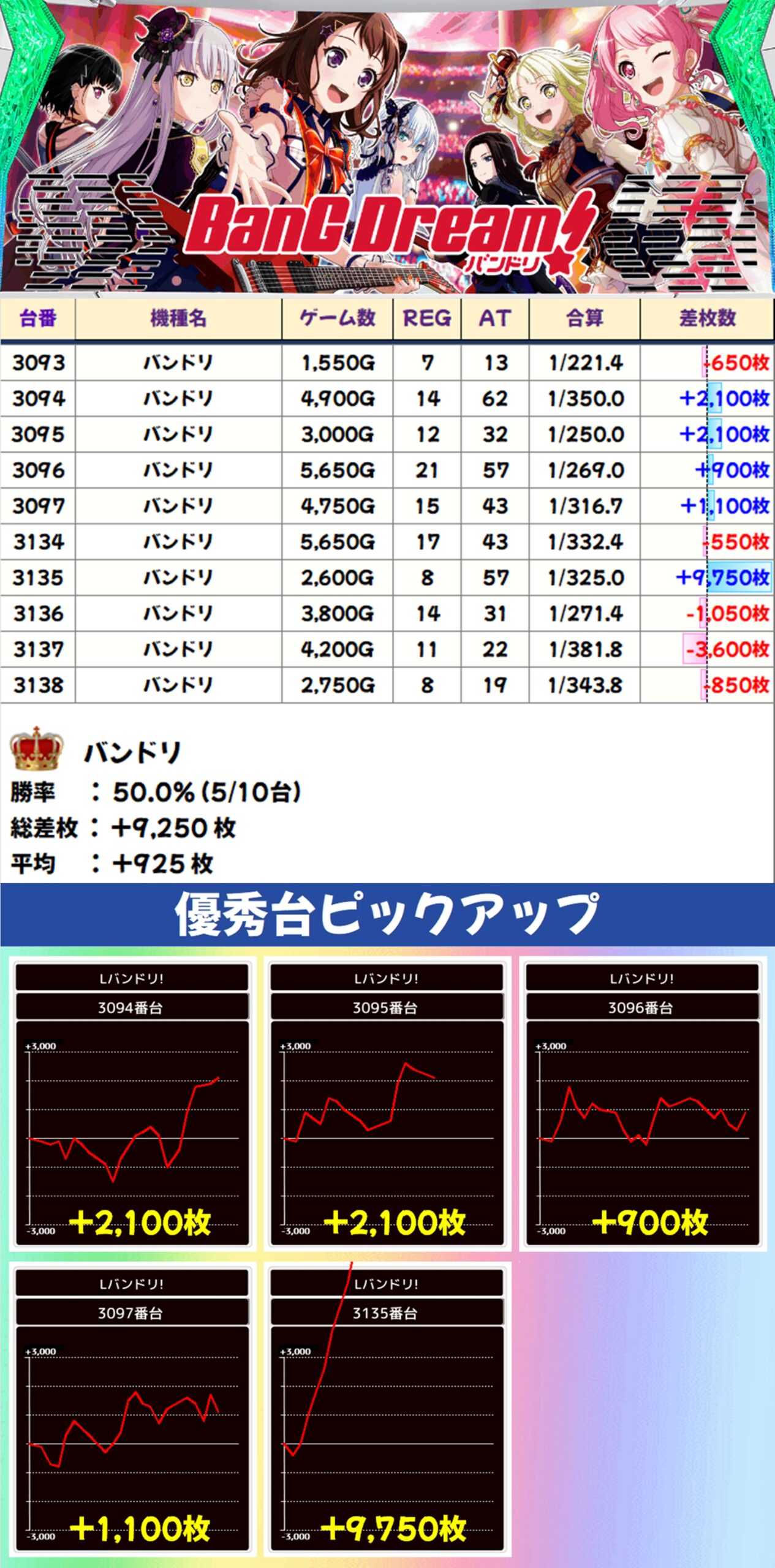 また、広町七深(バンドリ)を担当する西尾夕香さんの誕生日でもあり、バンドリも優秀な成績に。+9750枚の出玉を筆頭に半数がプラスとなっておりました!