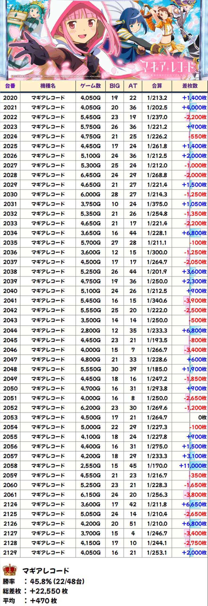 マギアレコード(22/48台+)→平均+470枚