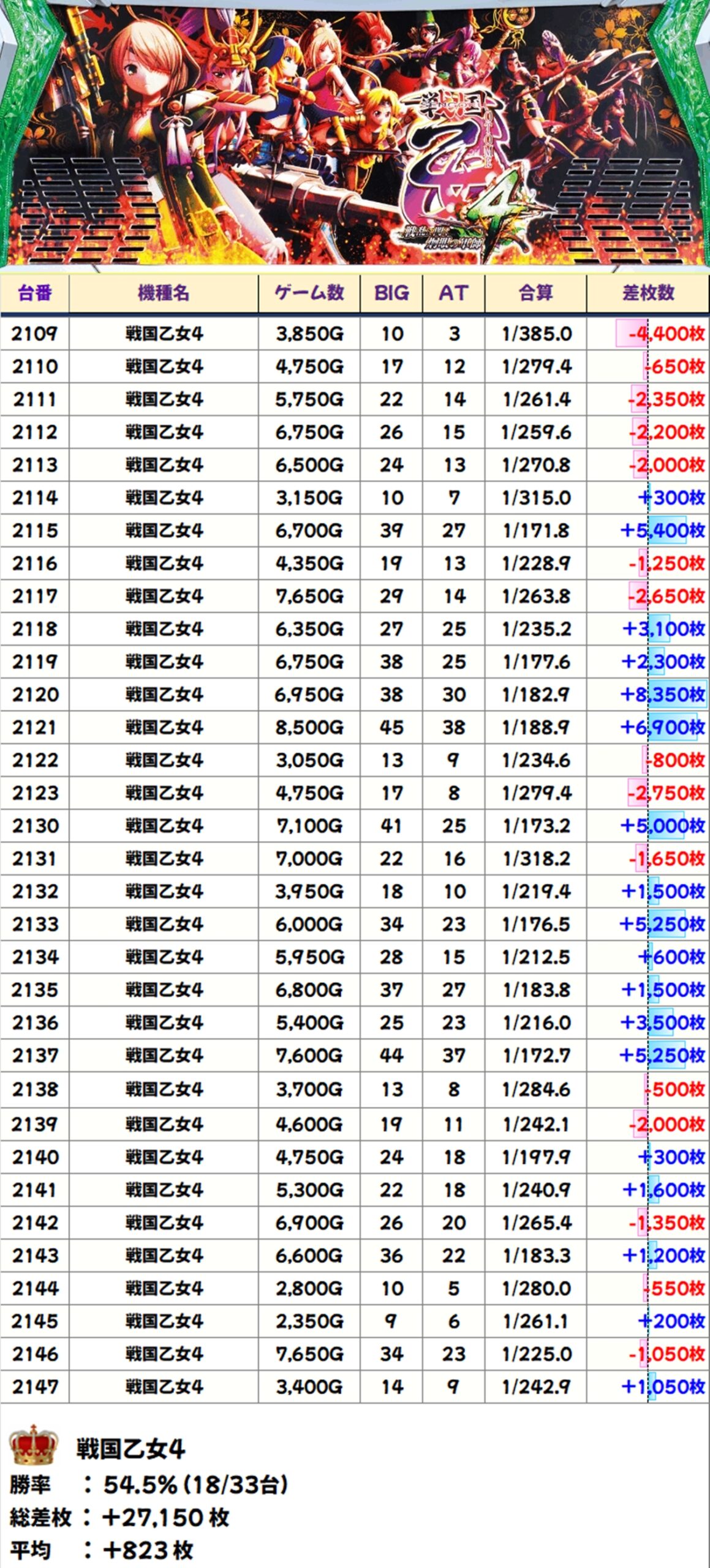 戦国乙女4(18/33台+)→平均+823枚