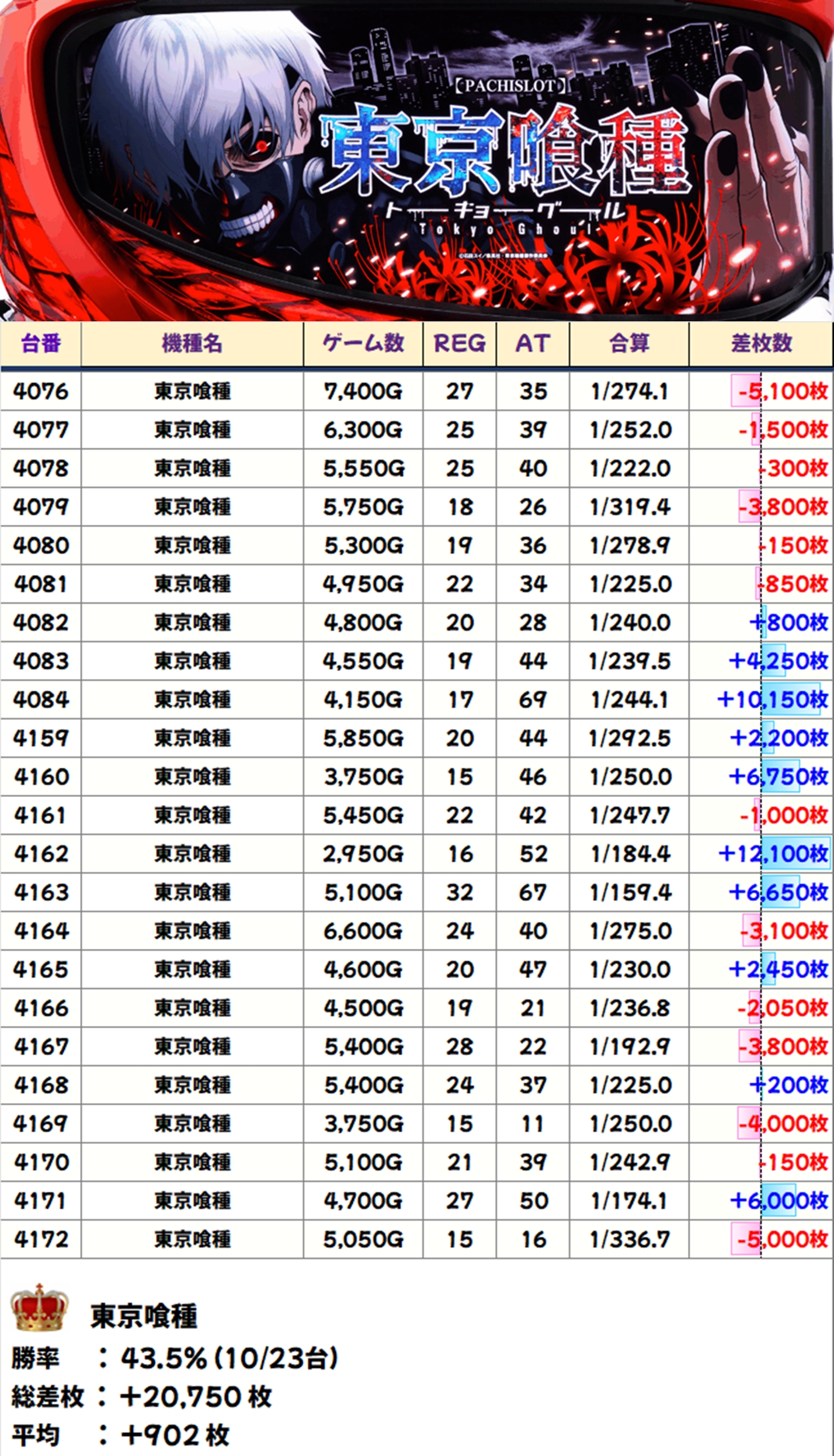 東京喰種(10/23台+)→平均+902枚