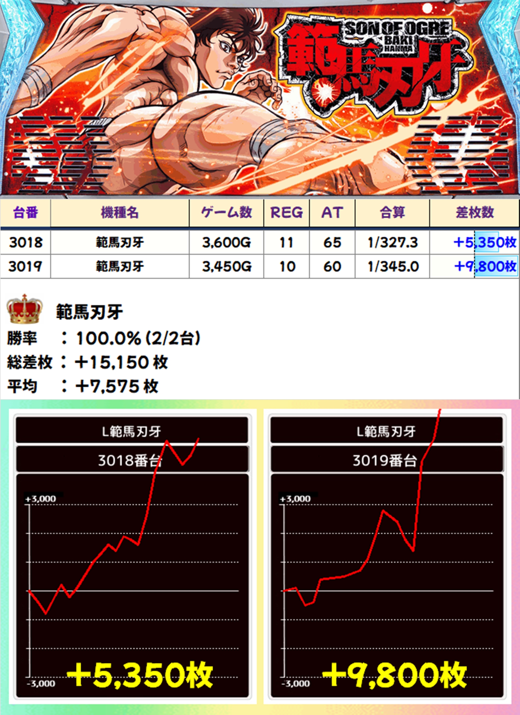 なお、範馬刃牙は+9800枚、+5350枚と2台ともに爆発し、平均+7575枚の超爆出しの結果となりました!