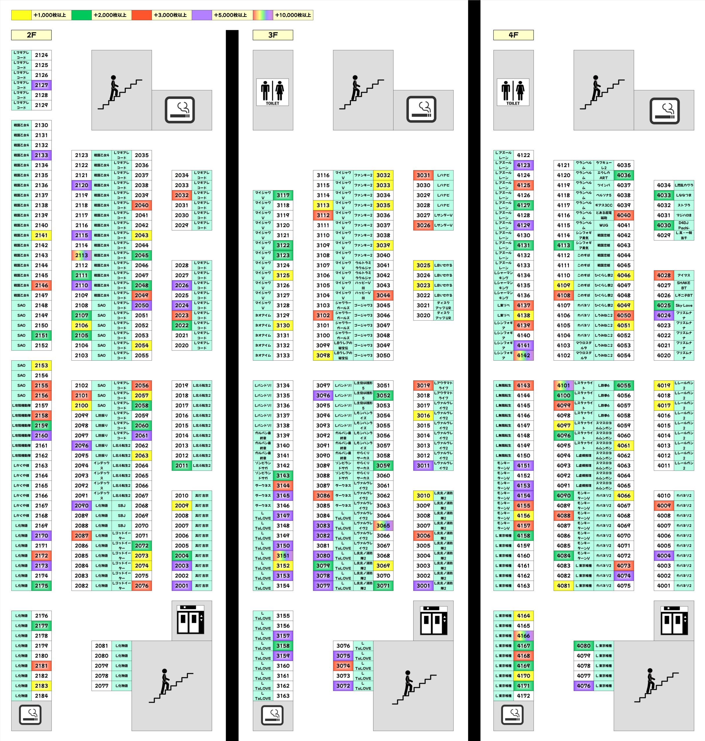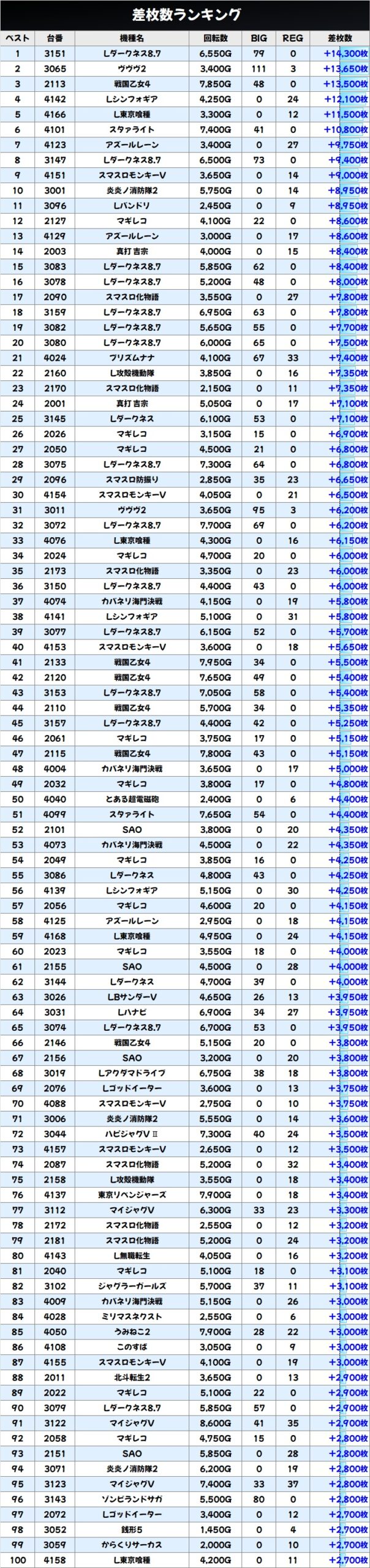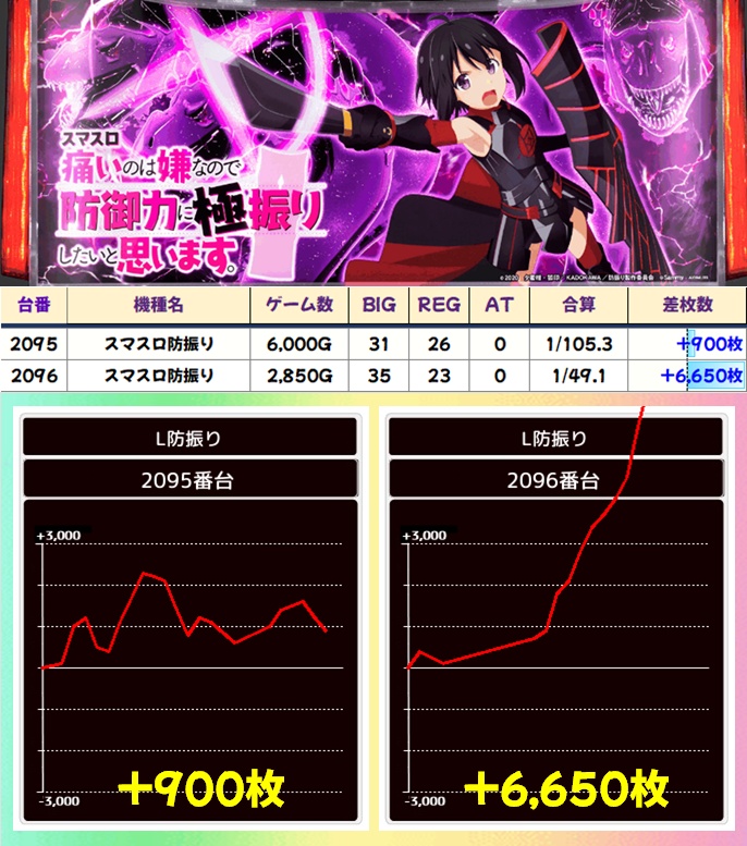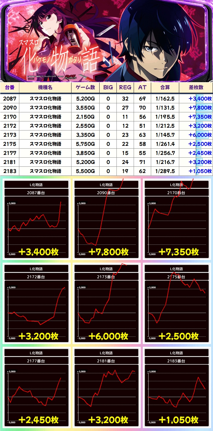 高配分もジャンプ関連が多く、また毎日力の入っているAKIBA神3のSAOも対象だった模様。いずれの機種も半数以上がプラス差枚で大量獲得台も多く見受けられたが、初動が悪かった台は稼働不足に終わった台もあるので埋もれてしまった当たり台もあるかも!?
