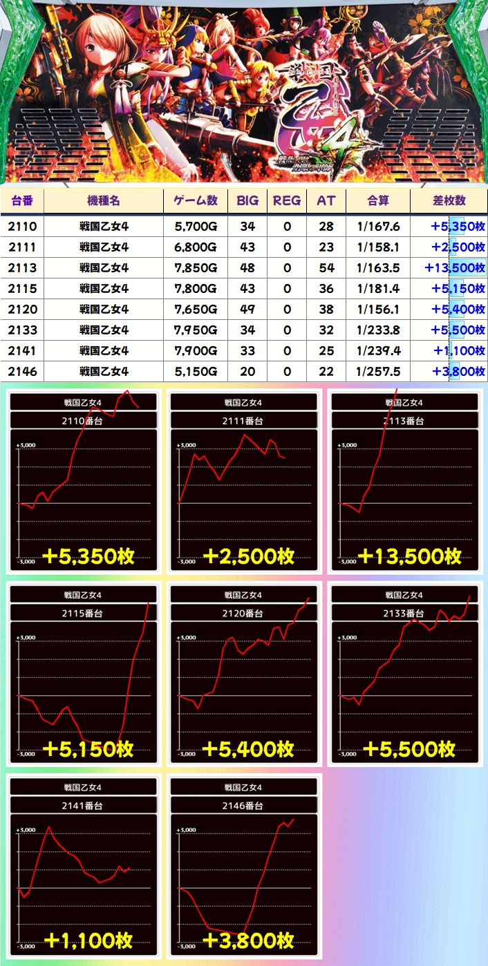 戦国乙女4(10/33台+)→平均+556枚