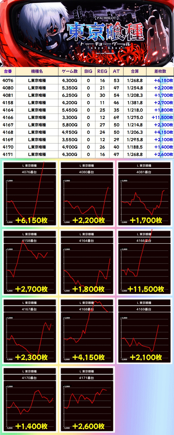 優秀台の数はマギレコが頭一つ抜けており、乙女4や東京喰種は万枚超など出玉面が優秀でした!!
