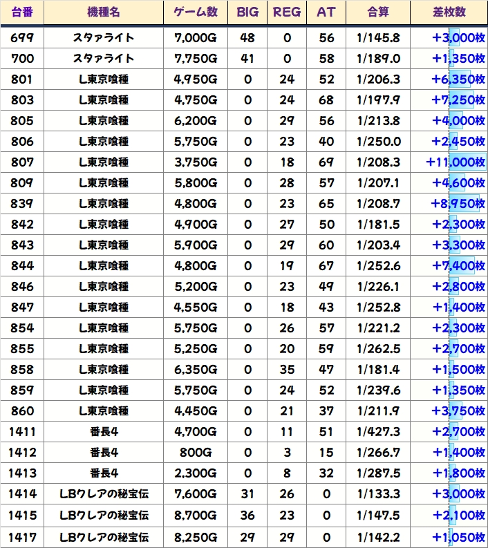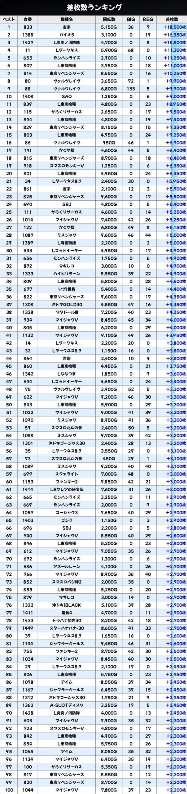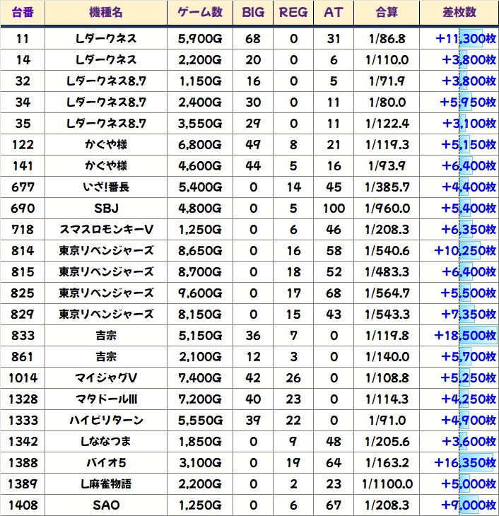 ココでは優秀台(+2000枚以上)をピックアップしていきます!データをチェックして立ち回りの参考にしてください!