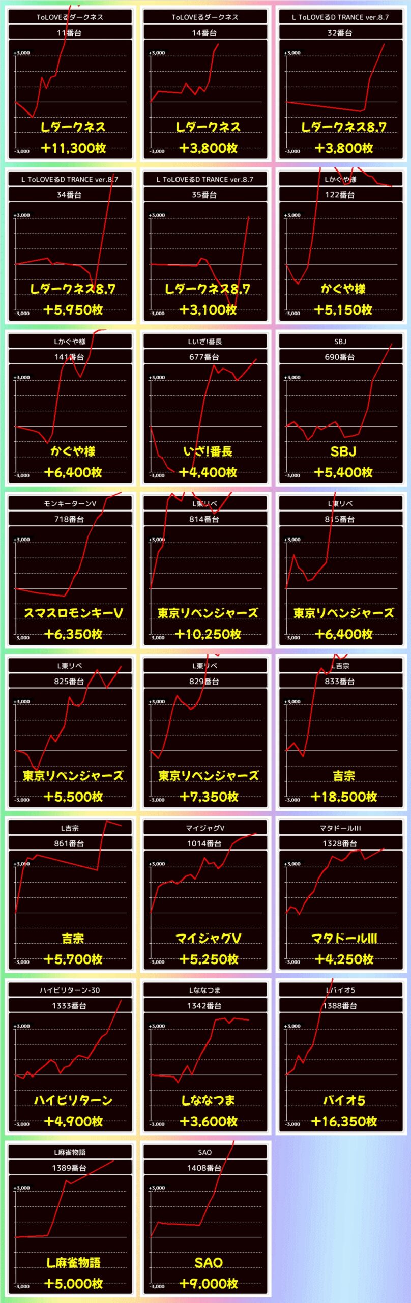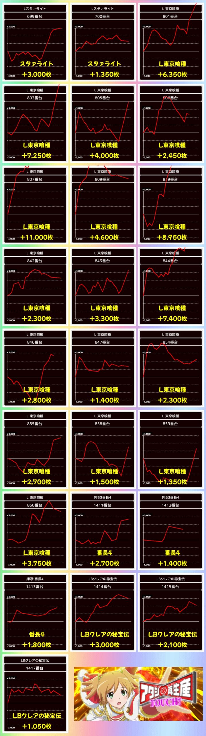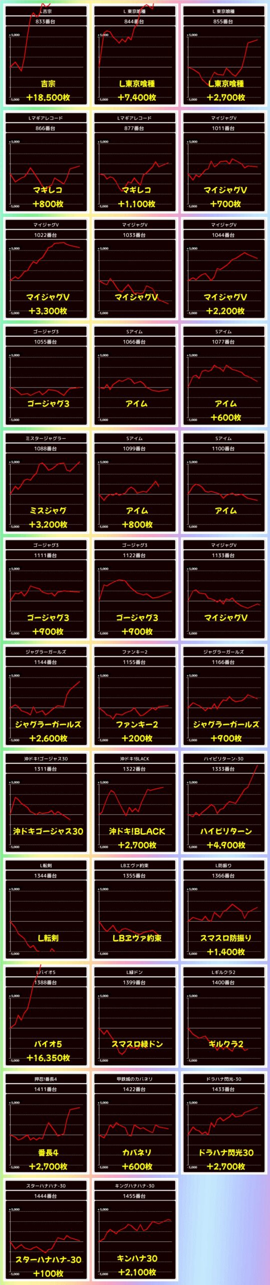 1/2系以上という枠組みにはしましたが、全系と言われても納得できるほど結果は優秀!台数の関係もあって東京喰種の扱いが良さそうに見えますが、全機種半数以上がプラスで2000枚超も大量にアリ!